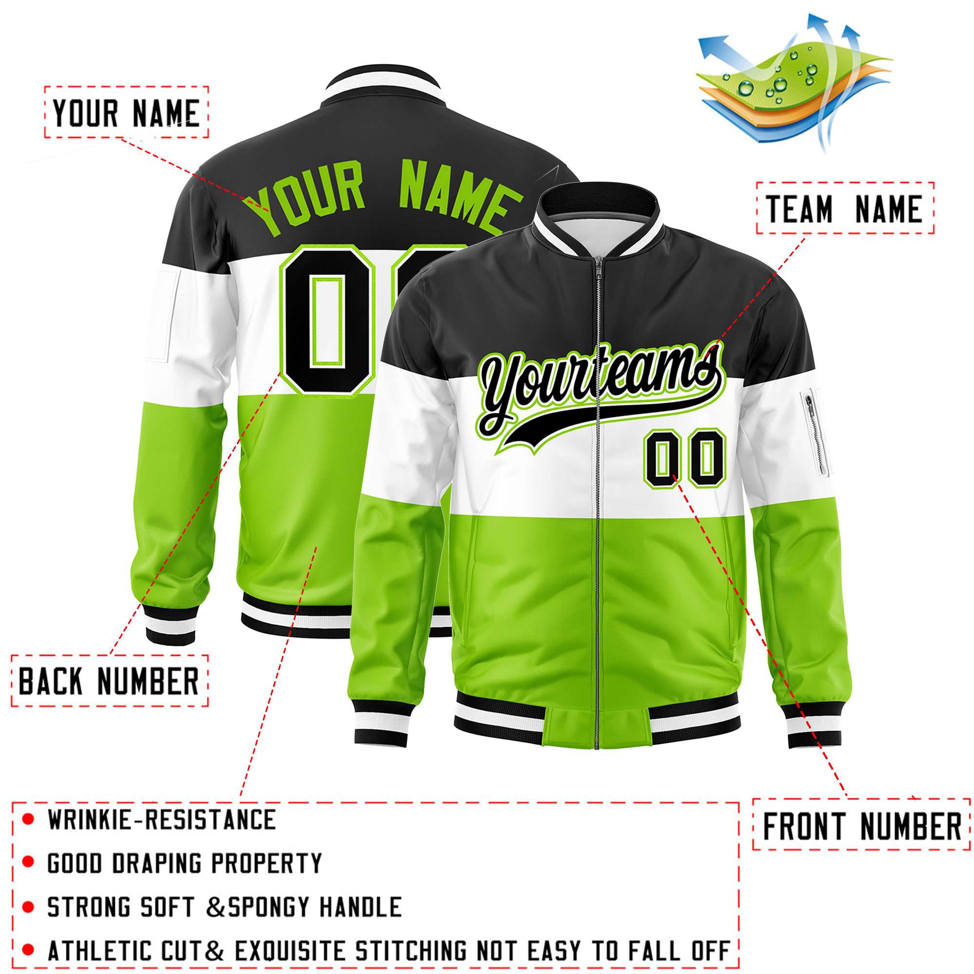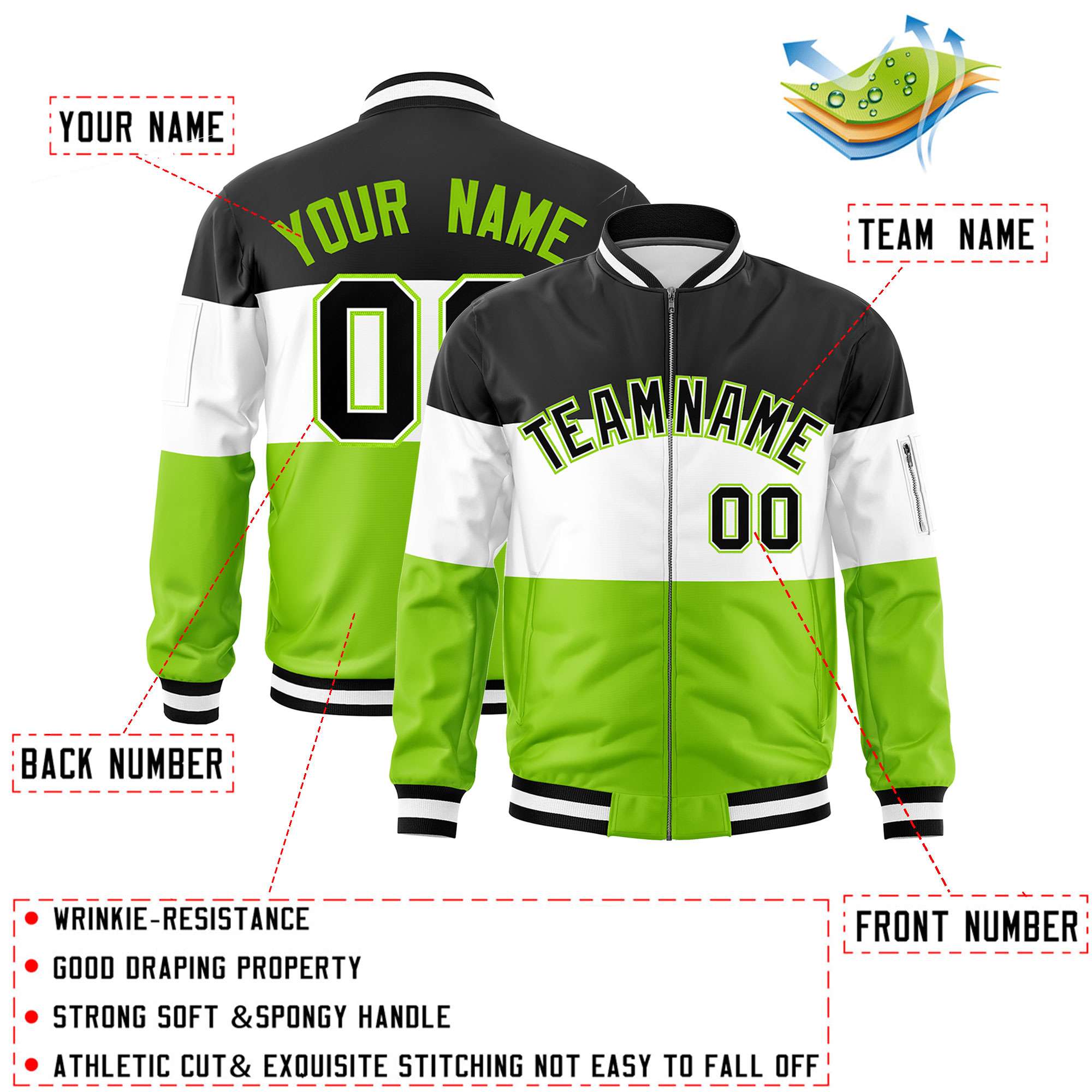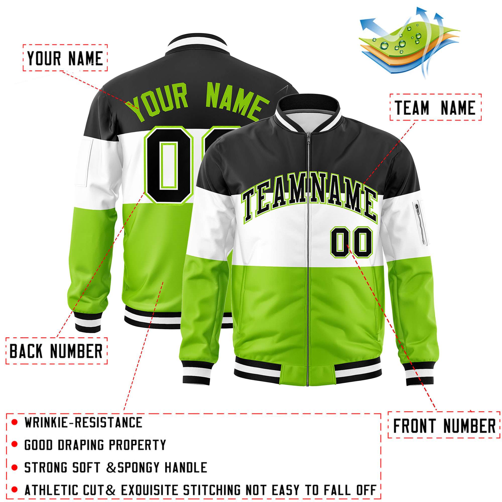 Custom Black White-Neon Green Varsity Full-Zip Color Block Letterman Bomber Jacket