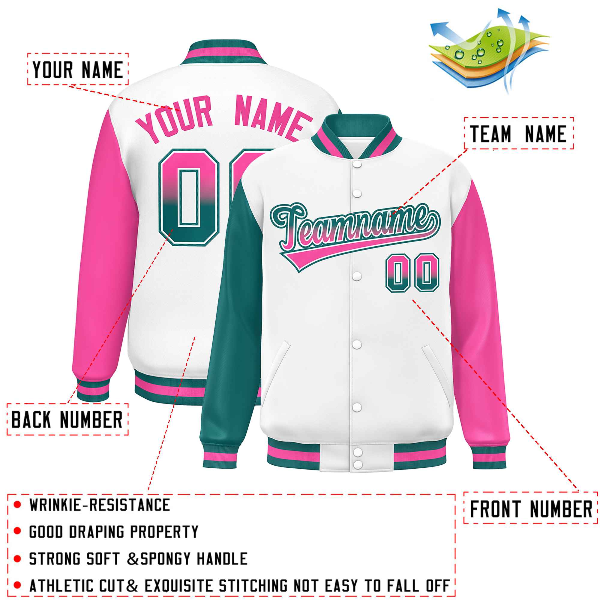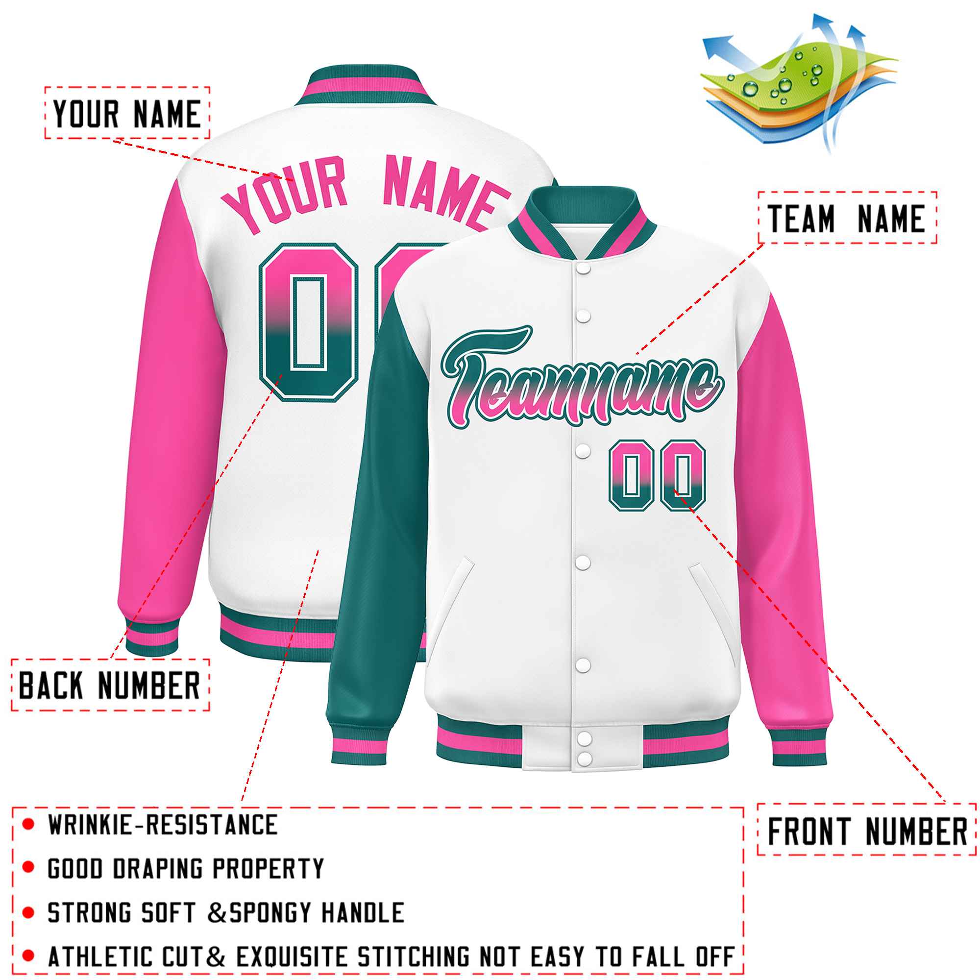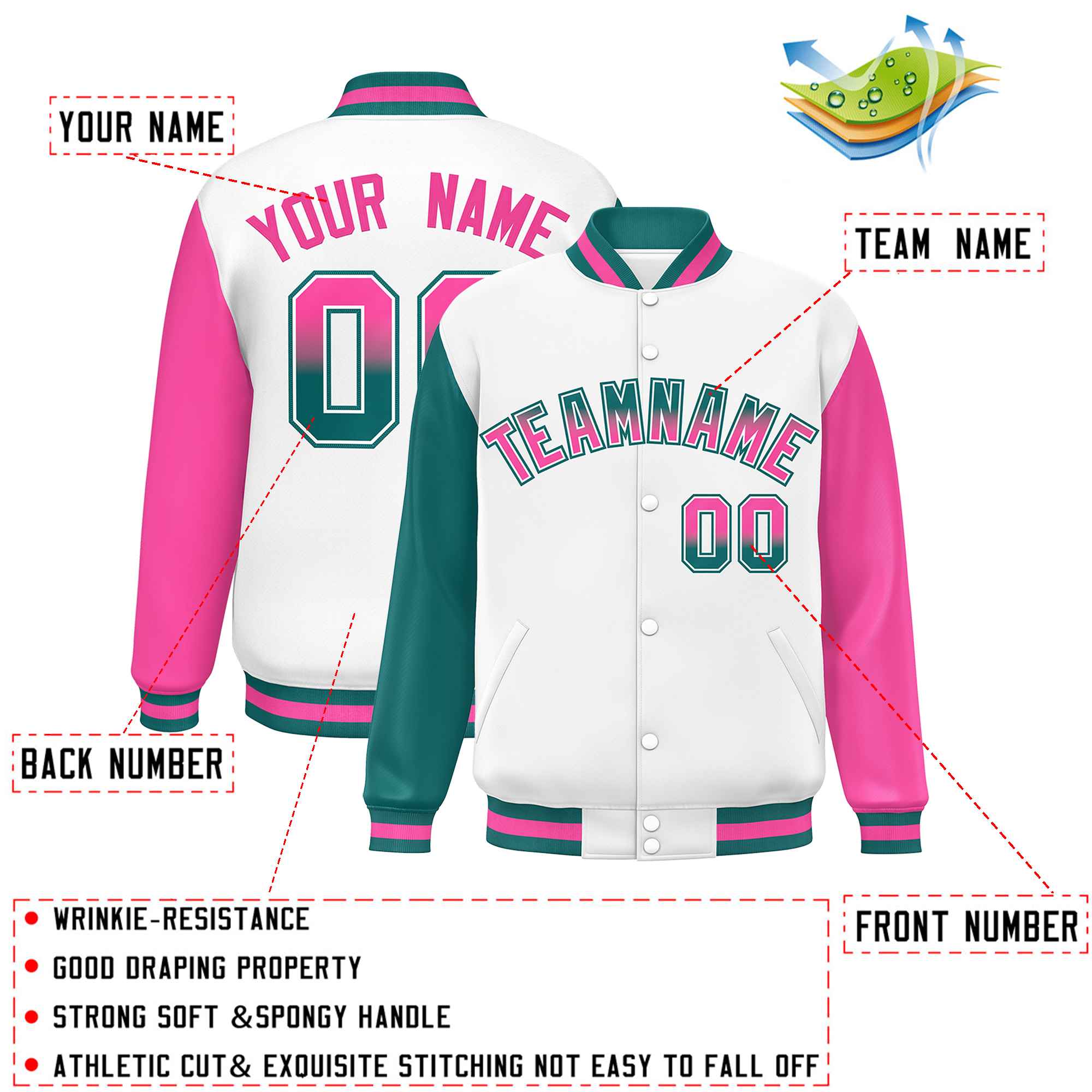 Custom White Aqua-Pink Varsity Full-Snap Raglan Sleeves Letterman Baseball Jacket