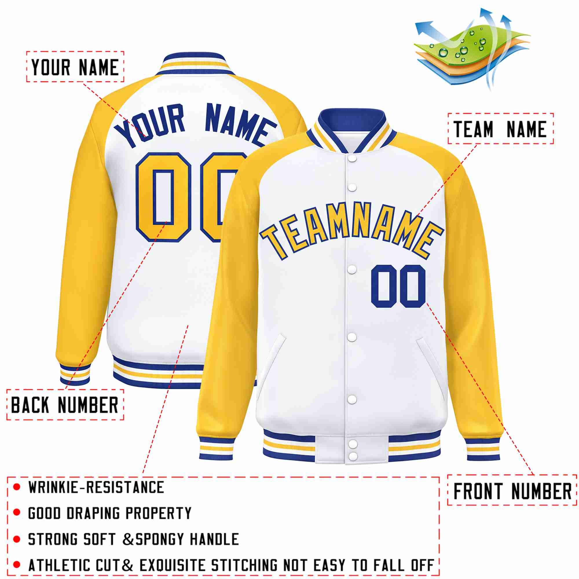 Custom White Gold-Royal Raglan Sleeves Varsity Full-Snap Letterman Jacket