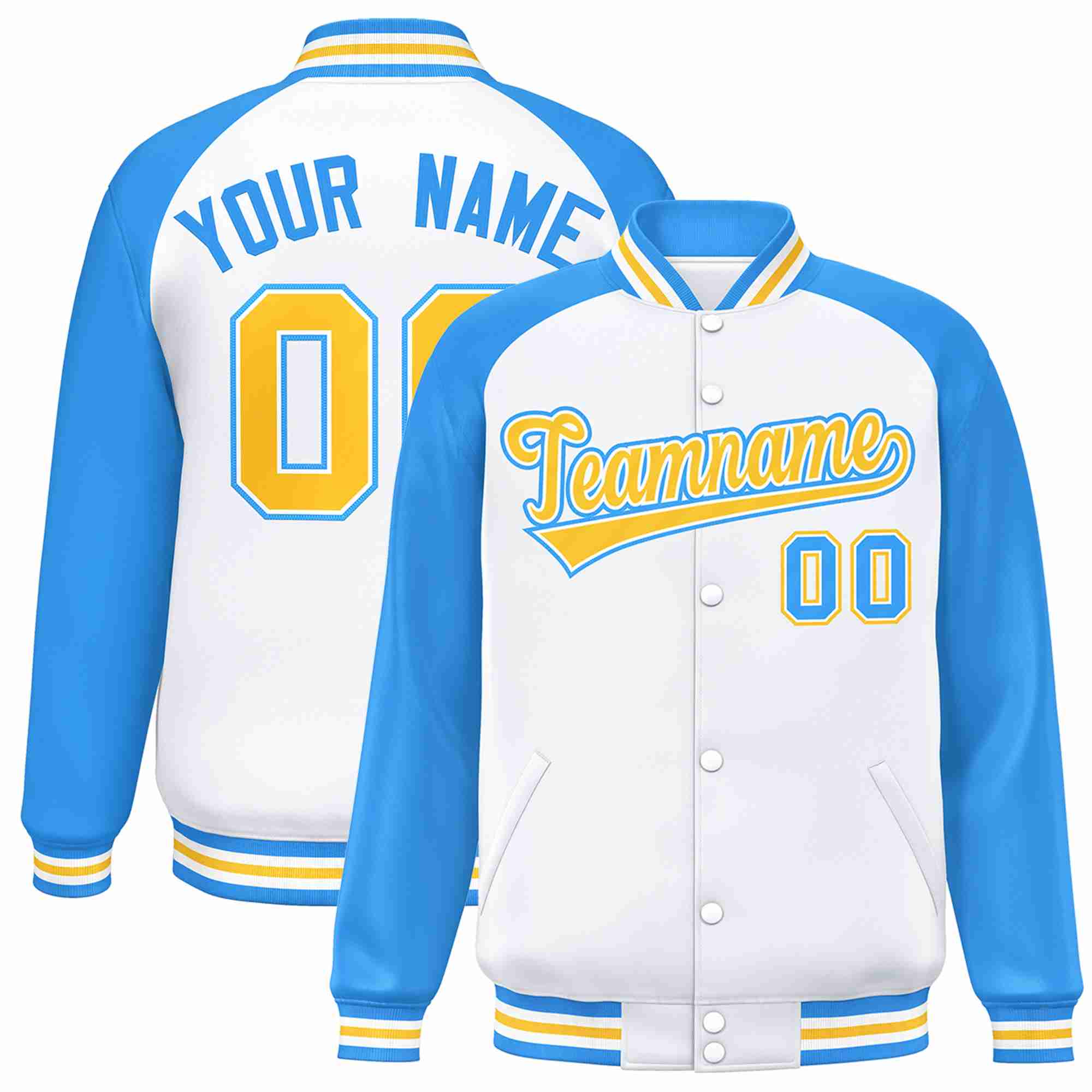 Custom White Gold-White Raglan Sleeves Varsity Full-Snap Letterman Jacket