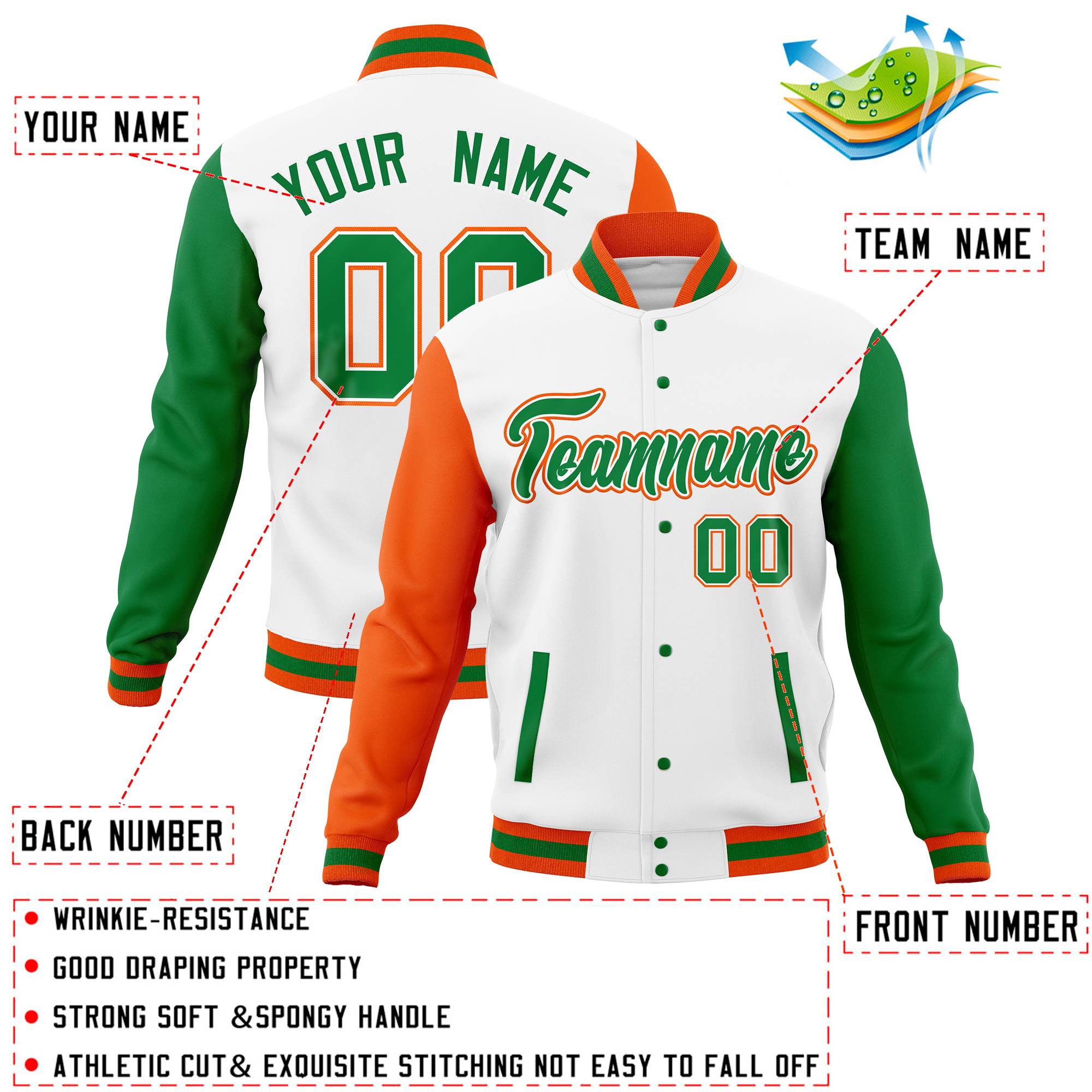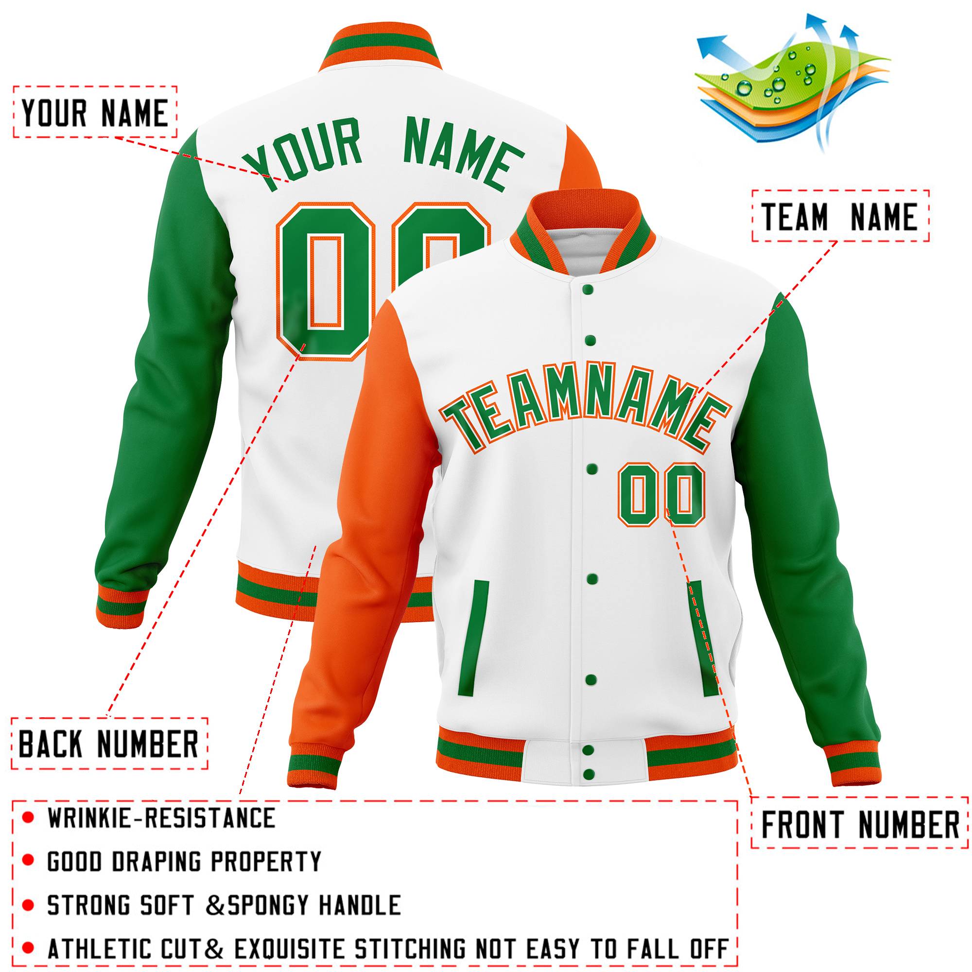Custom White Kelly Green-Orange Full-Snap Varsity Raglan Sleeves Letterman Baseball Jacket