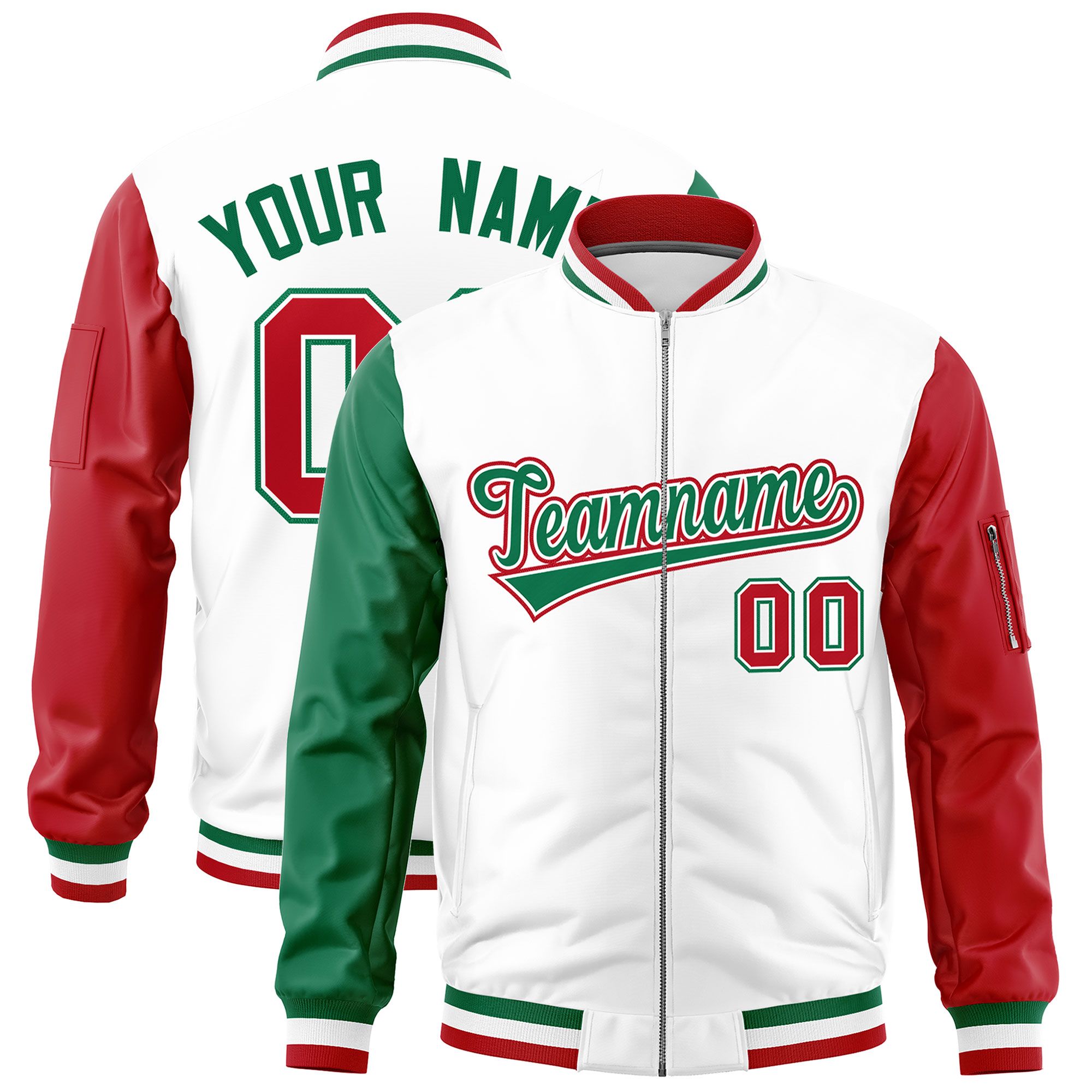 Custom White Kelly Green Red Varsity Full-Zip Raglan Sleeves Letterman Bomber Jacket