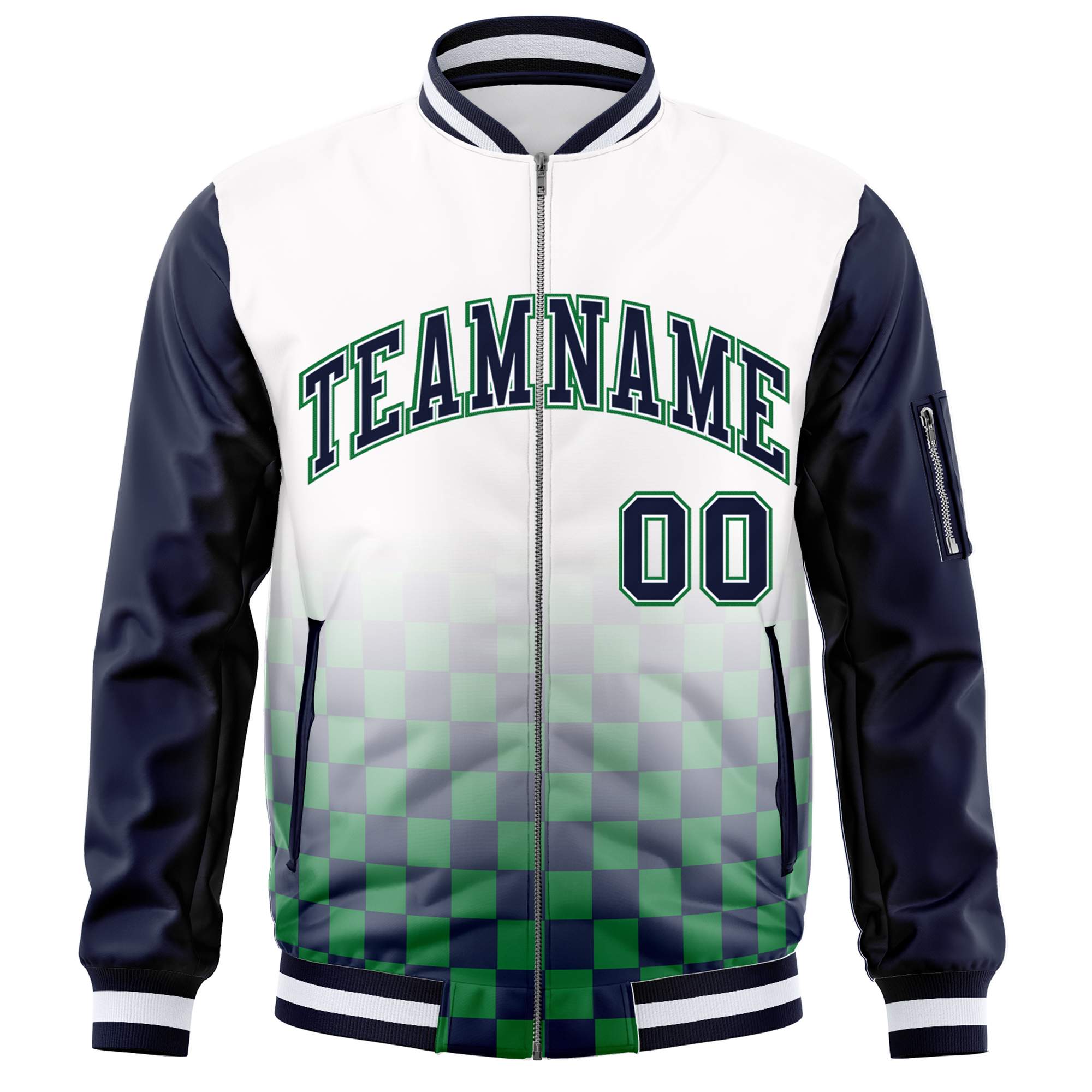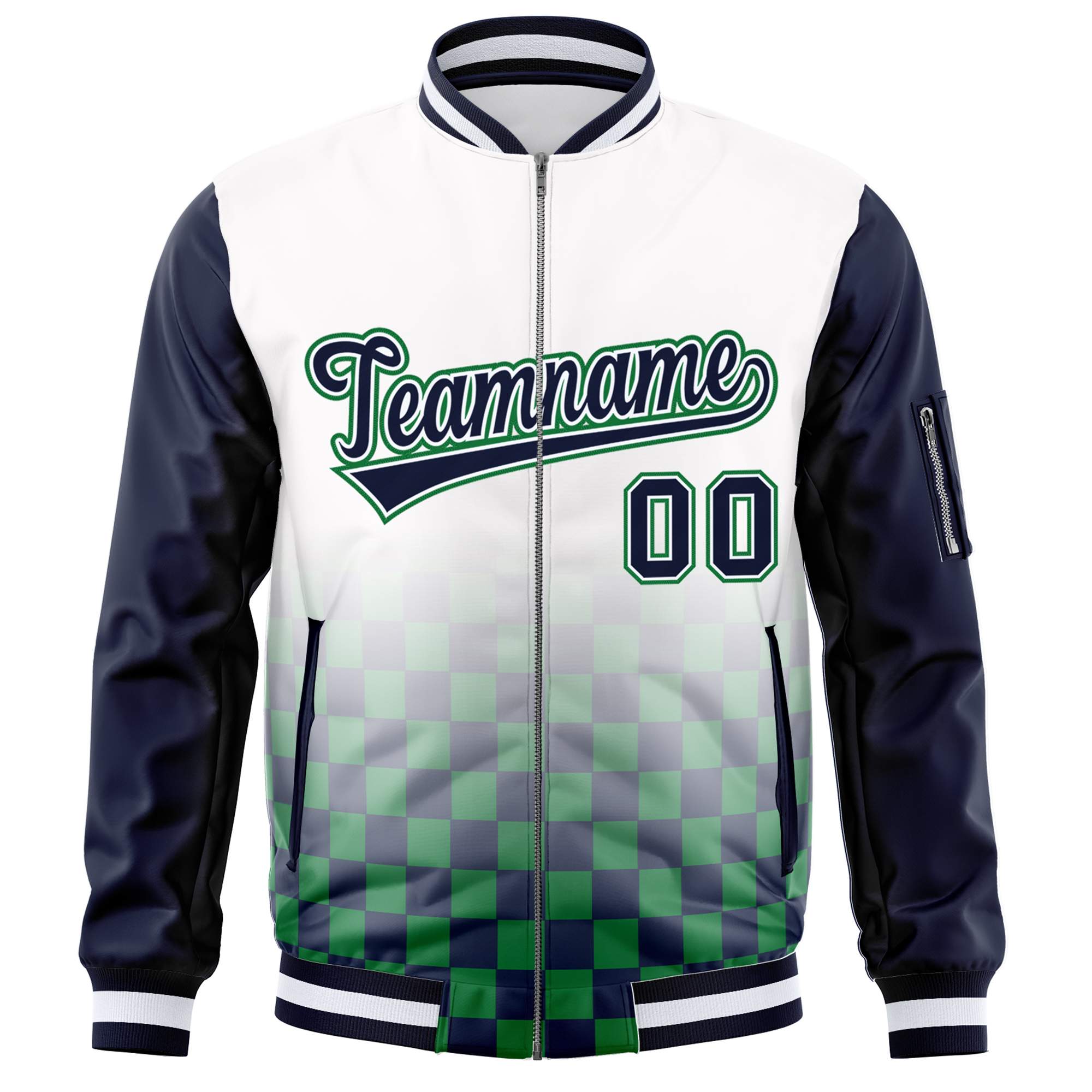 Custom White Navy-Kelly Green Grid Varsity Full-Zip Color Block Letterman Raglan Sleeve Jacket