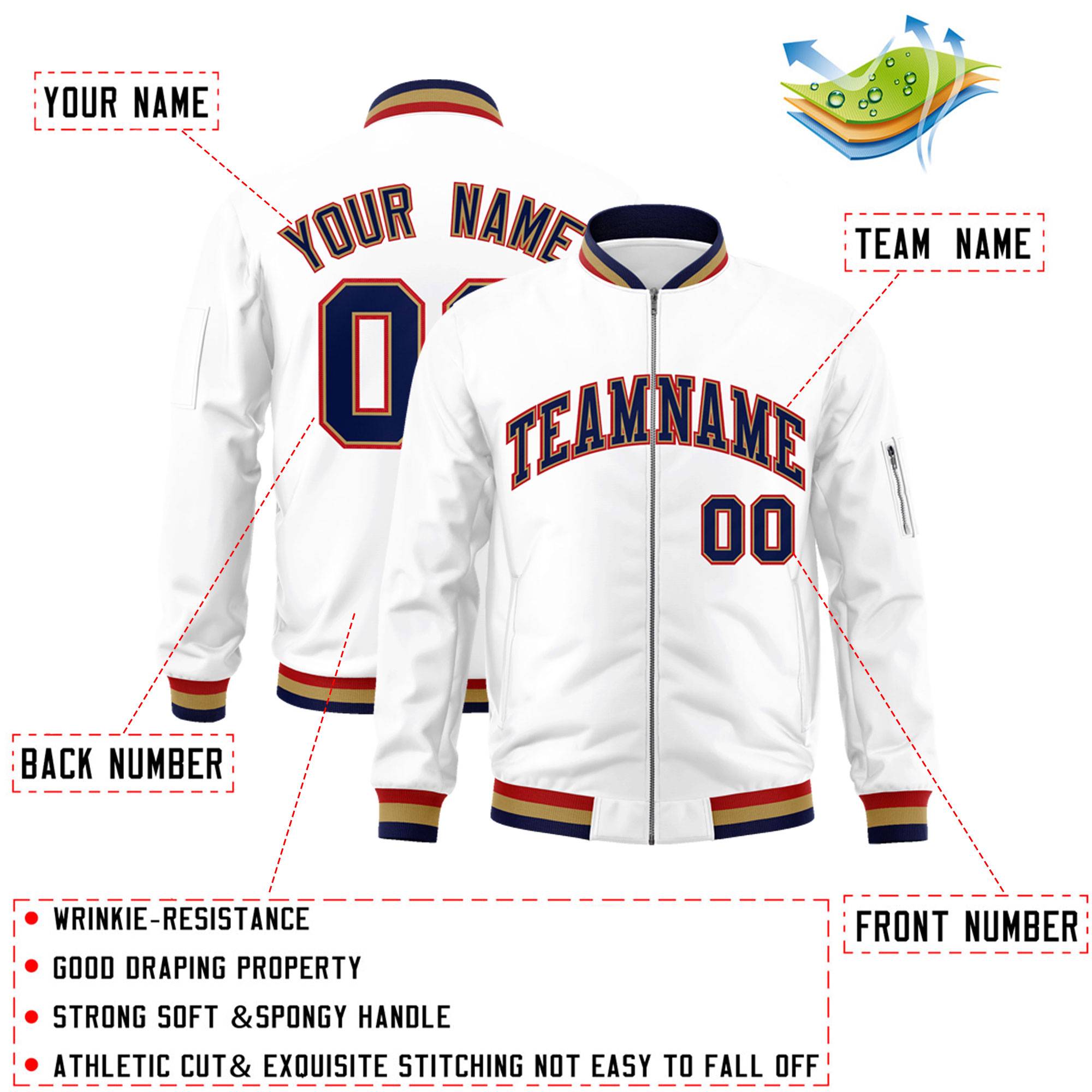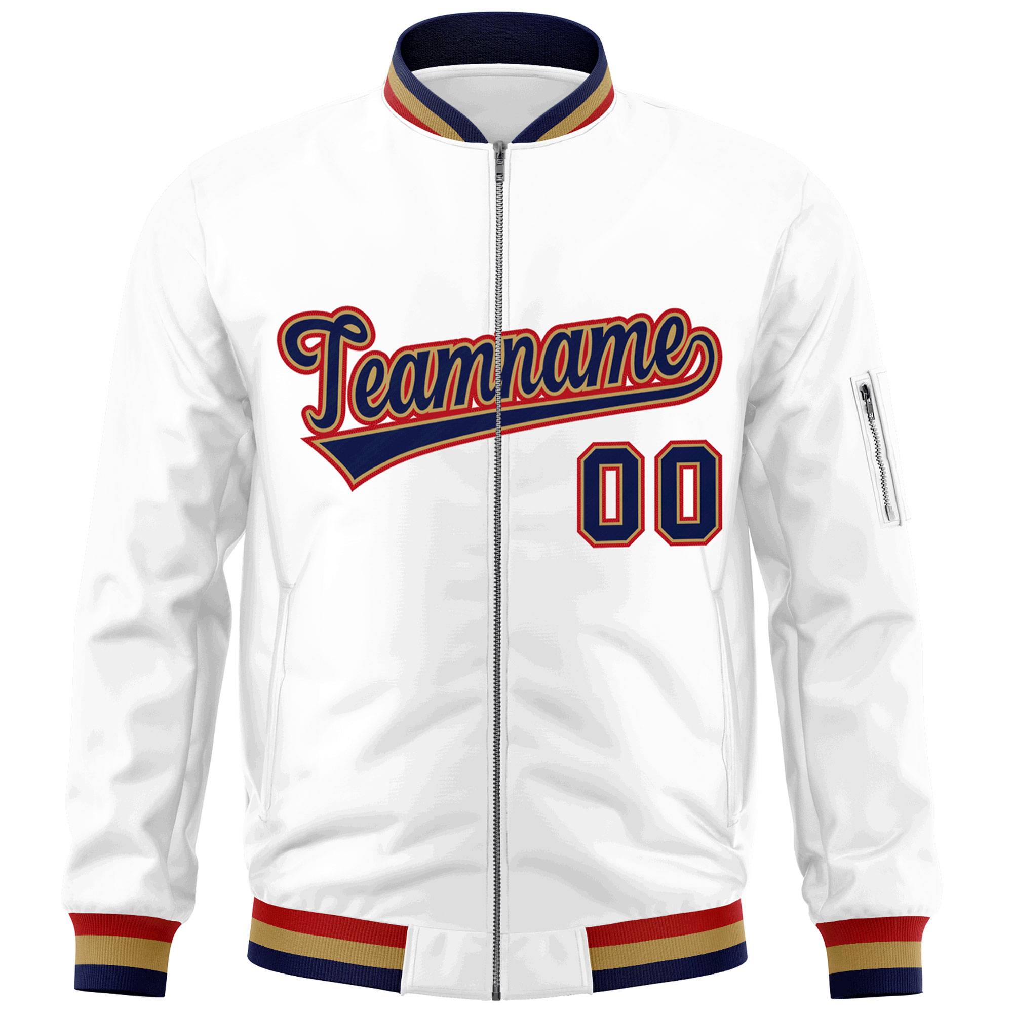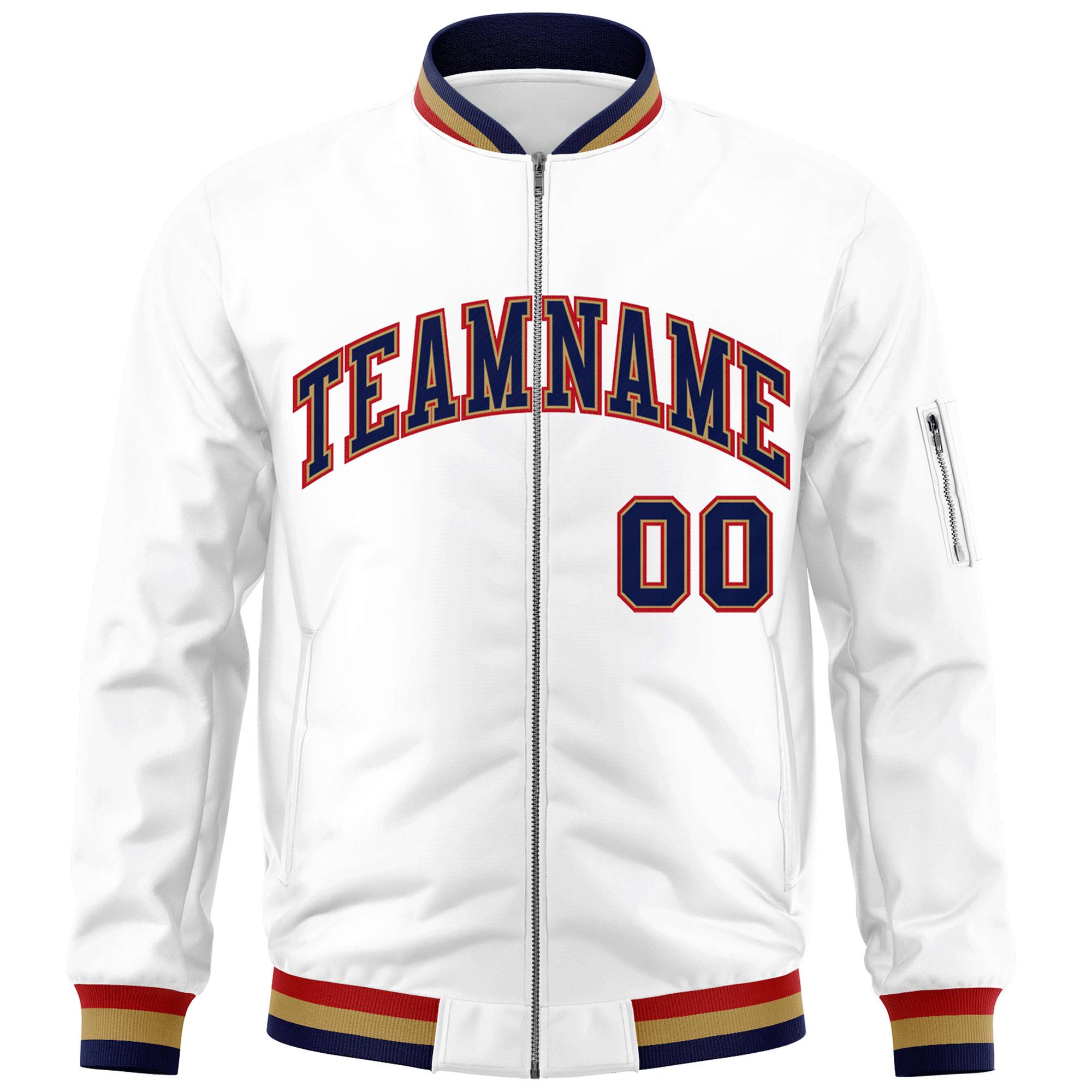 Custom White Navy-Red Varsity Full-Zip Letterman Bomber Jacket