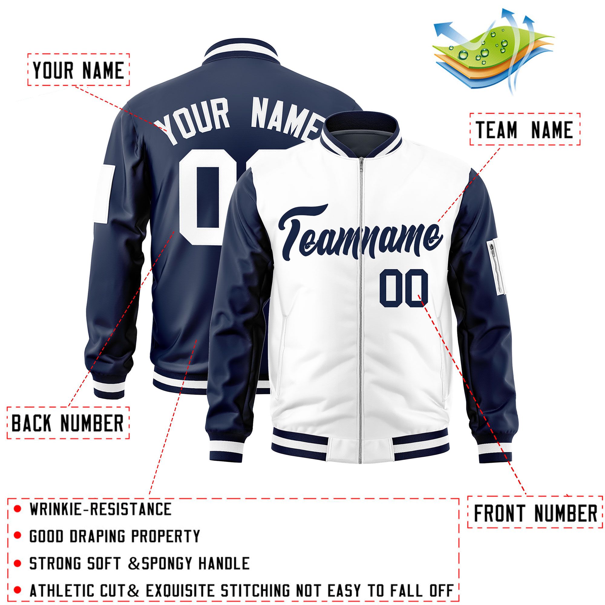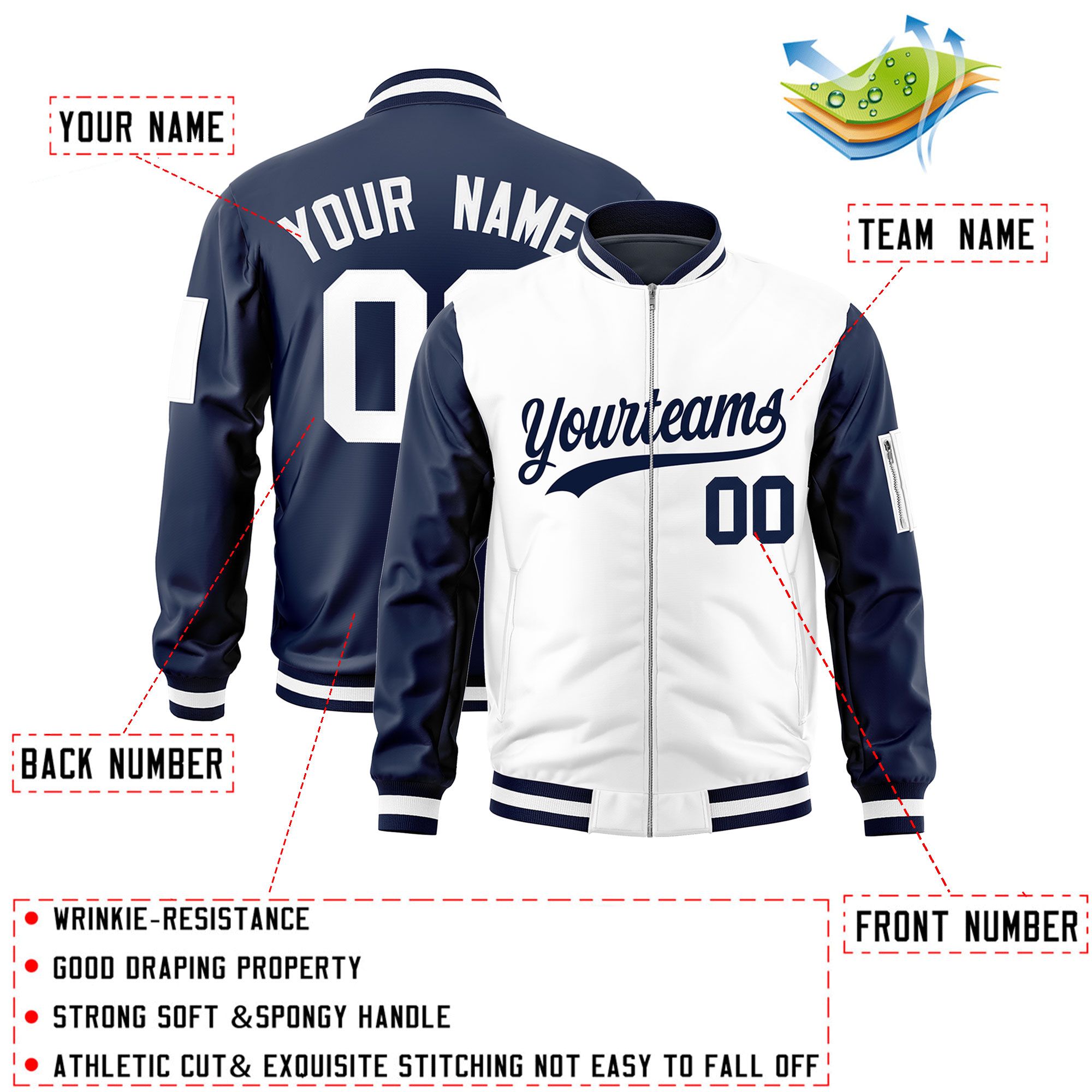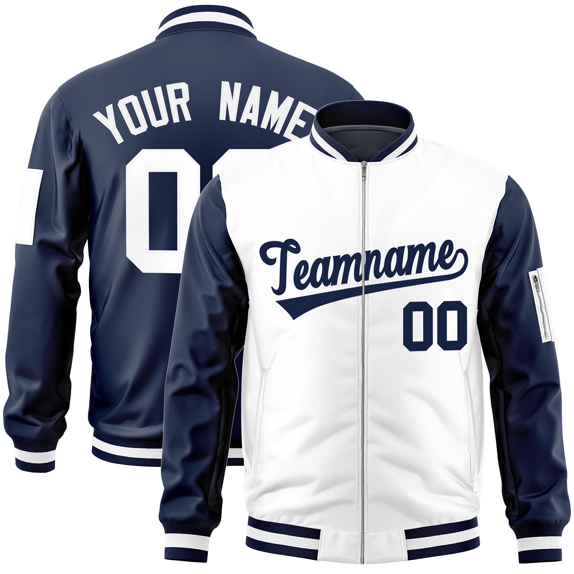 Custom White Navy Varsity Full-Zip Two-Tone Letterman Bomber Jacket