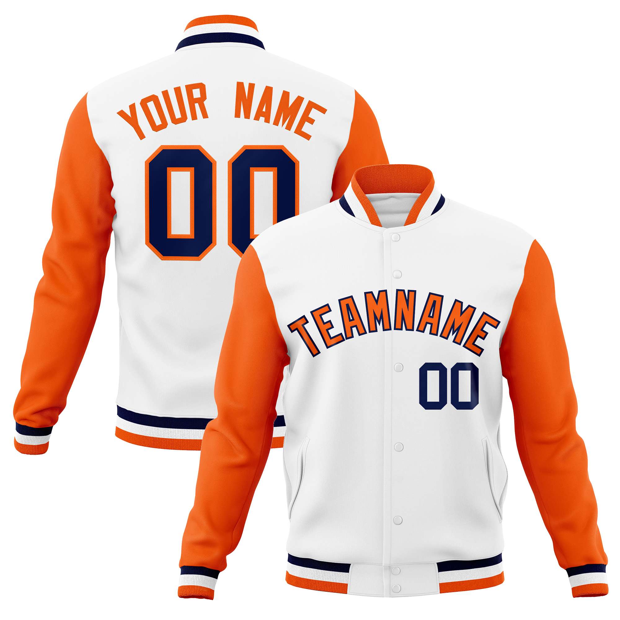 Custom White Orange-Navy Varsity Full-Snap Raglan Sleeves Letterman Baseball Jacket