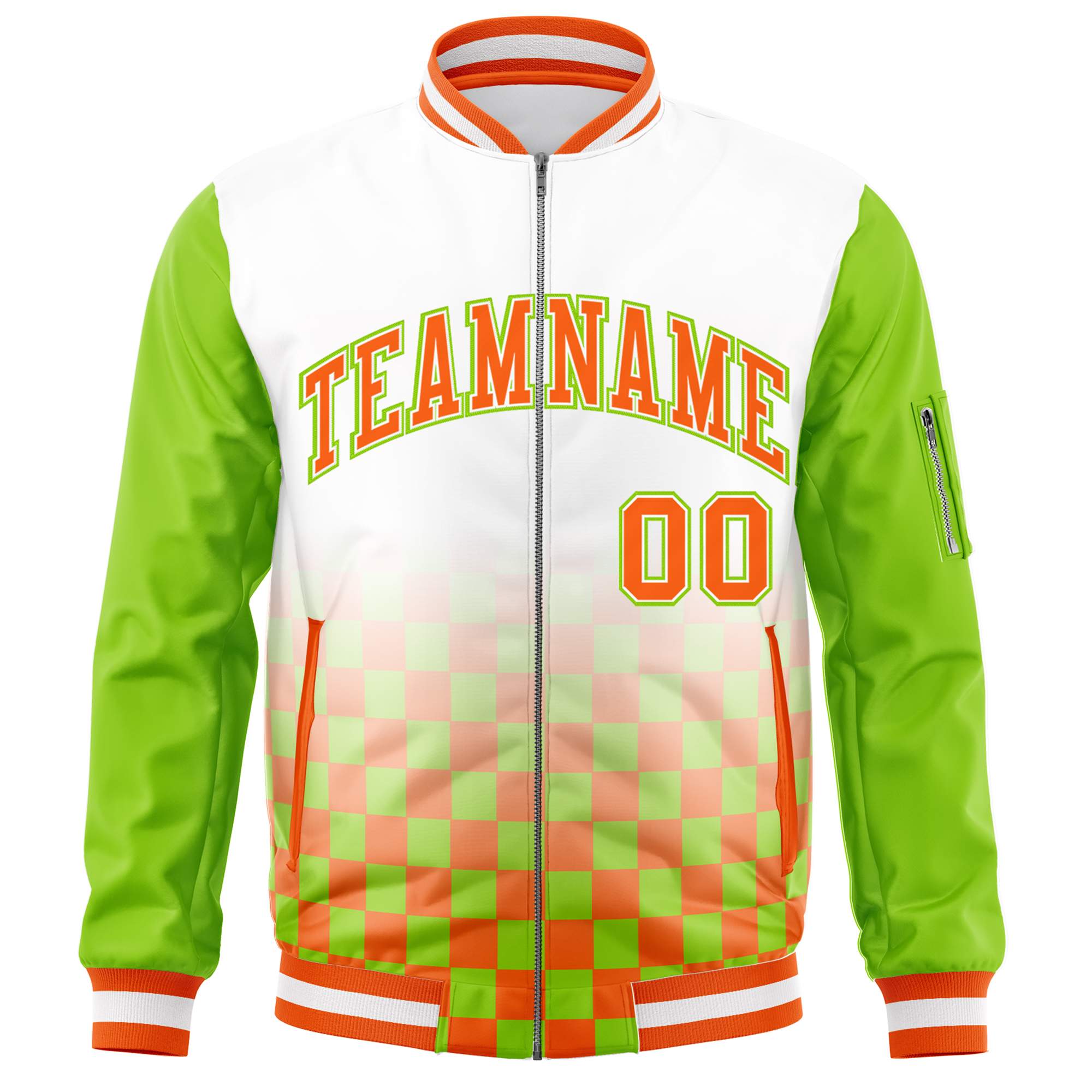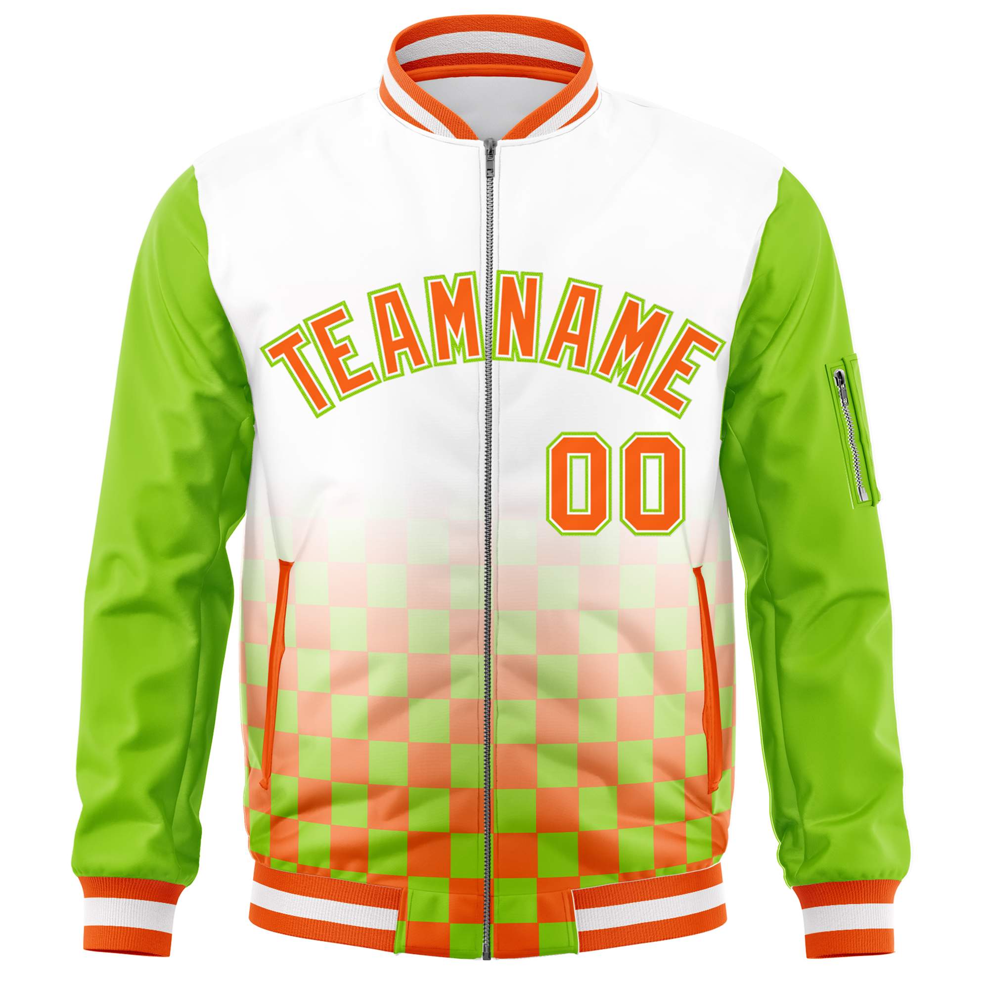 Custom White Orange-Neon Green Grid Varsity Full-Zip Color Block Letterman Raglan Sleeve Jacket