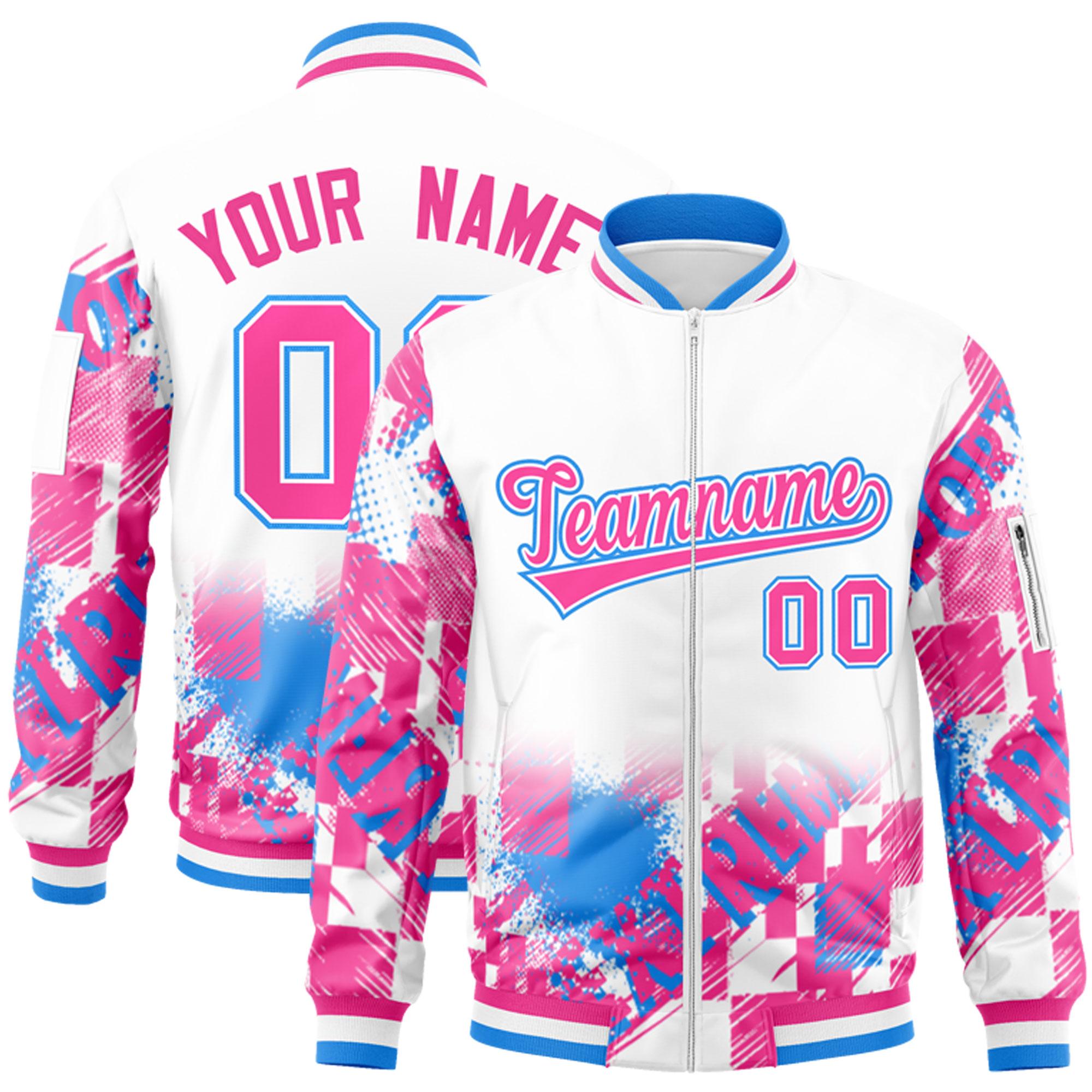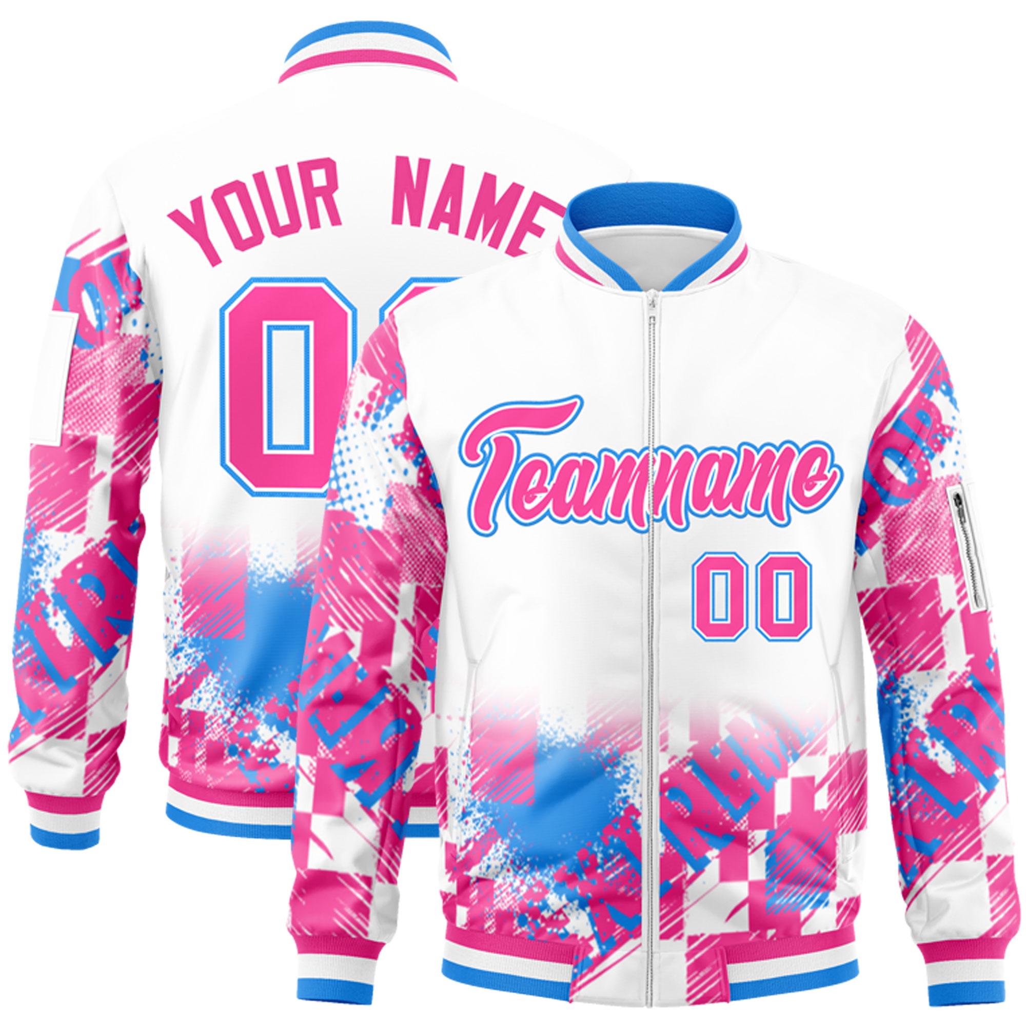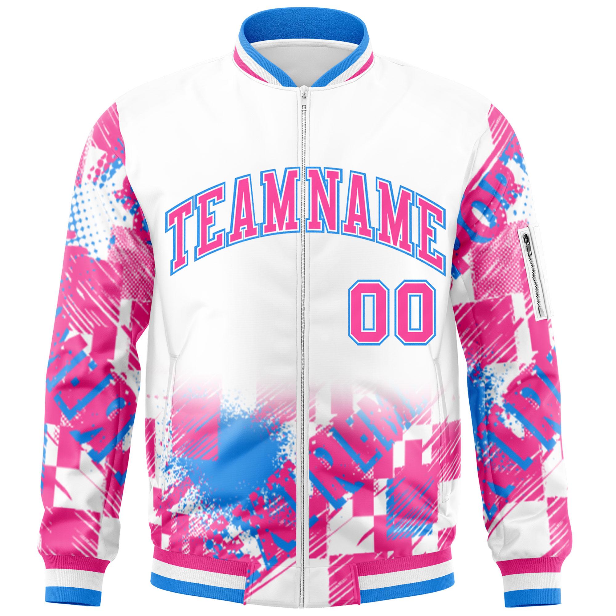 Custom White Pink-Powder Blue Varsity Full-Zip Street Graffiti Pattern Letterman Jacket