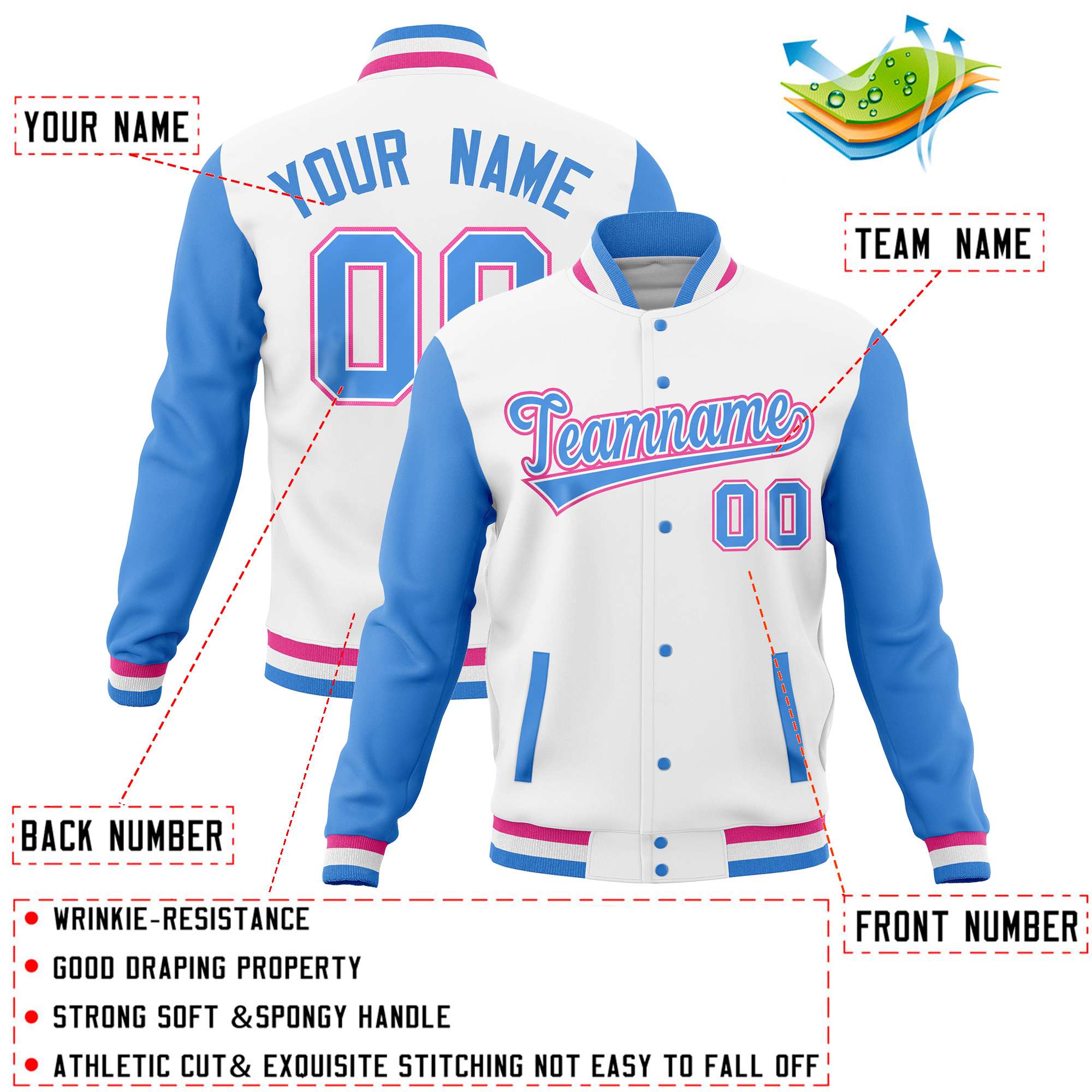 Custom White Powder Blue Varsity Full-Snap Raglan Sleeves Letterman Baseball Jacket