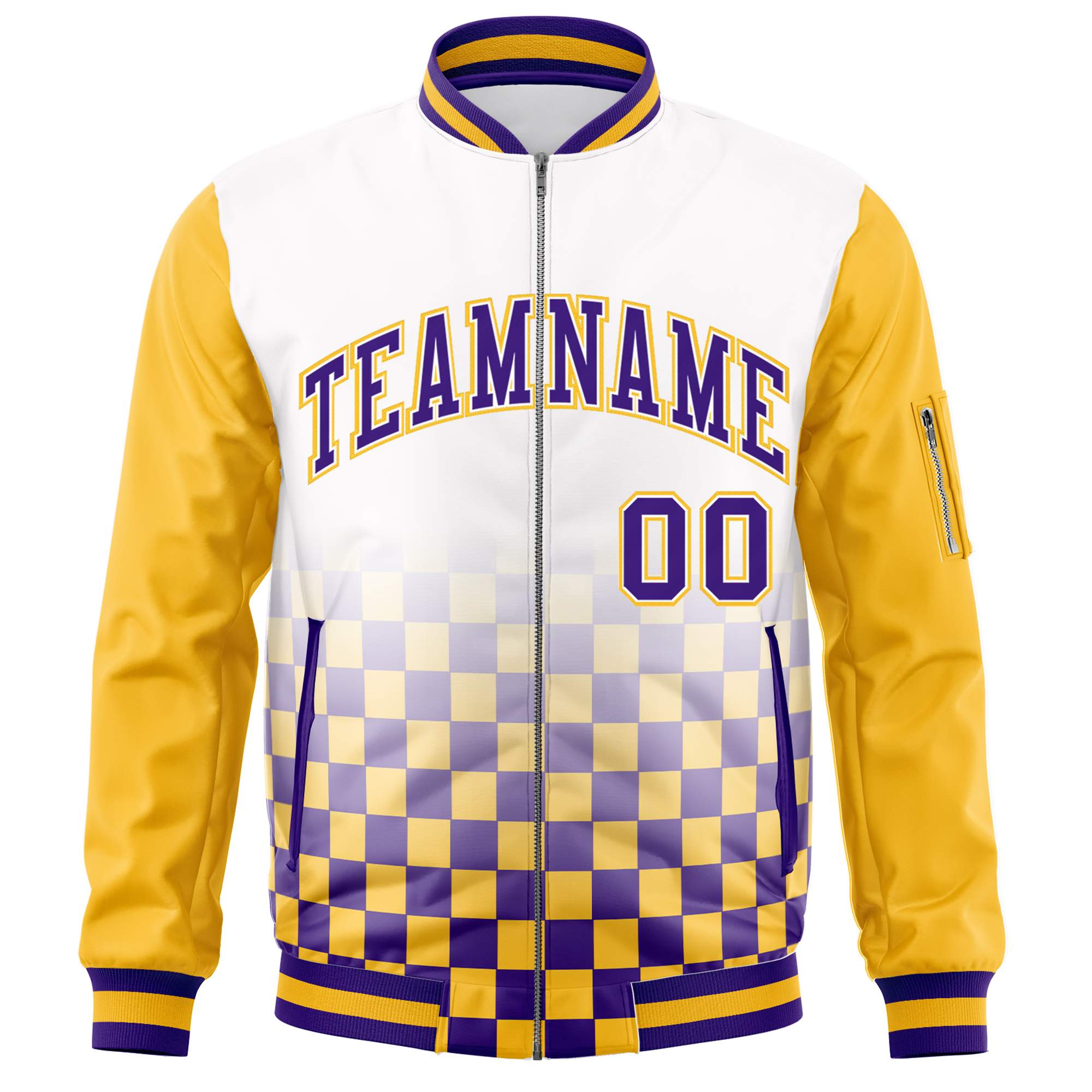 Custom White Purple-Gold Grid Varsity Full-Zip Color Block Letterman Raglan Sleeve Jacket