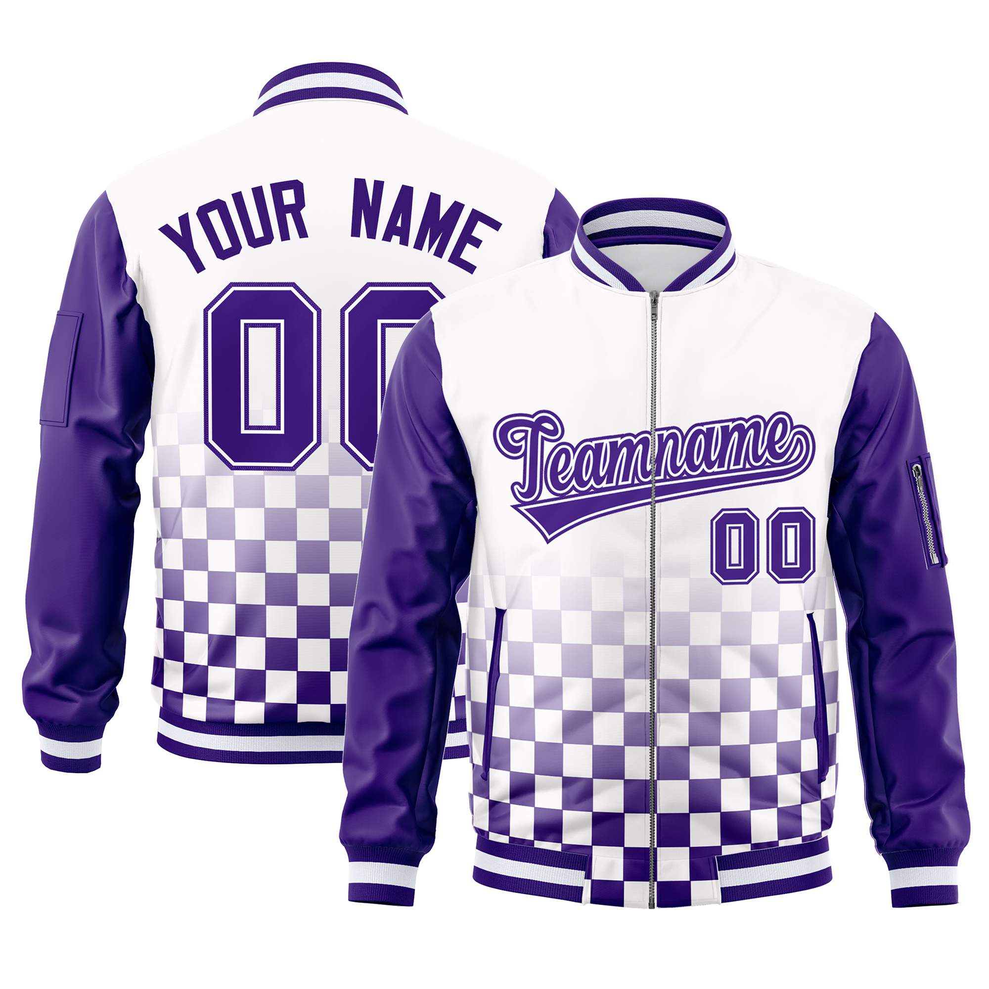 Custom White Purple Grid Varsity Full-Zip Color Block Letterman Raglan Sleeve Jacket