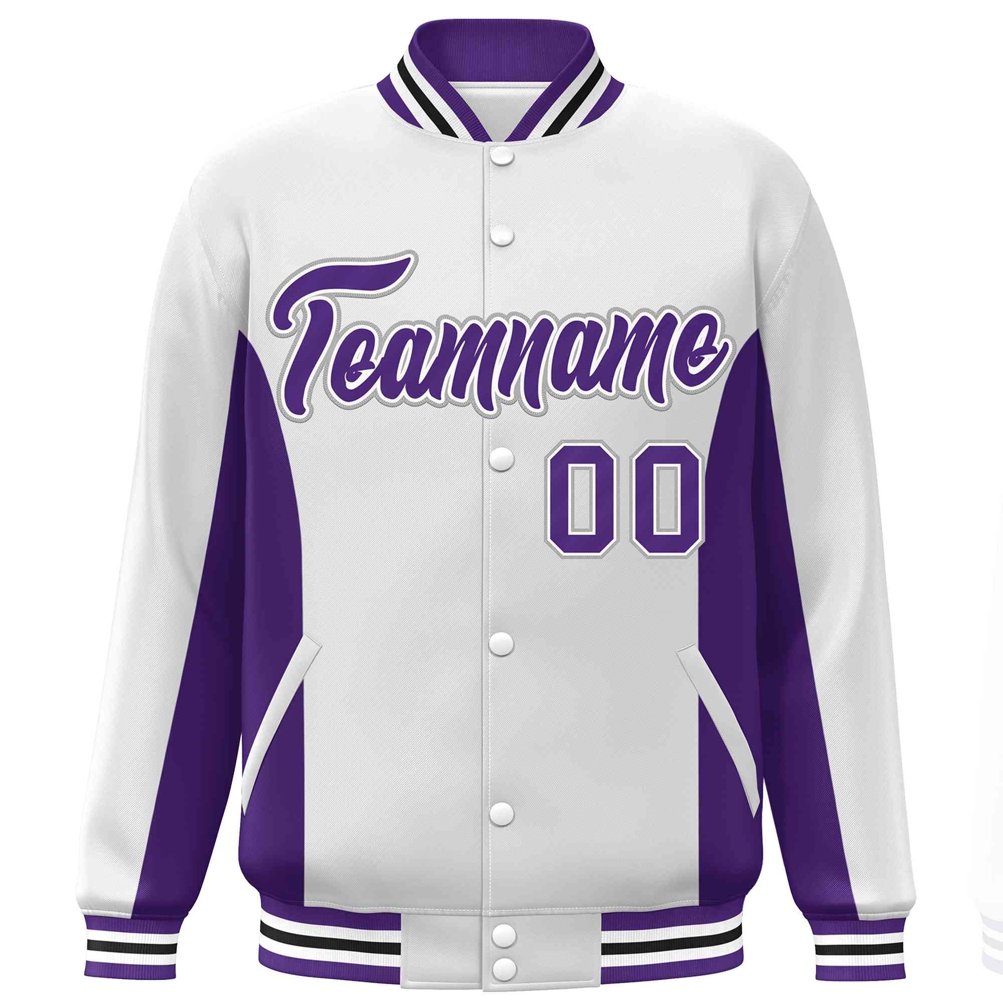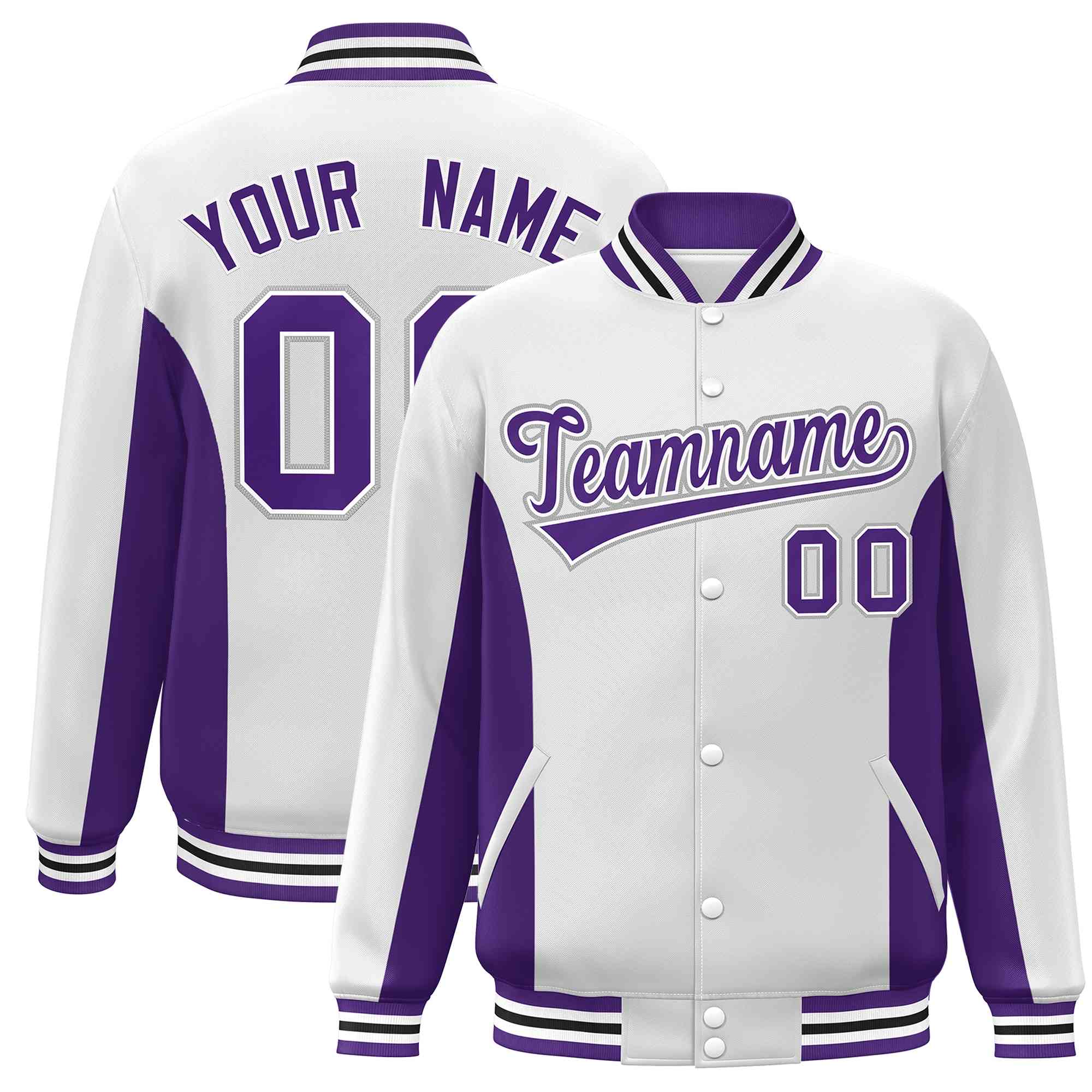 Custom White Purple Varsity Full-Snap Color Block Letterman Baseball Jacket