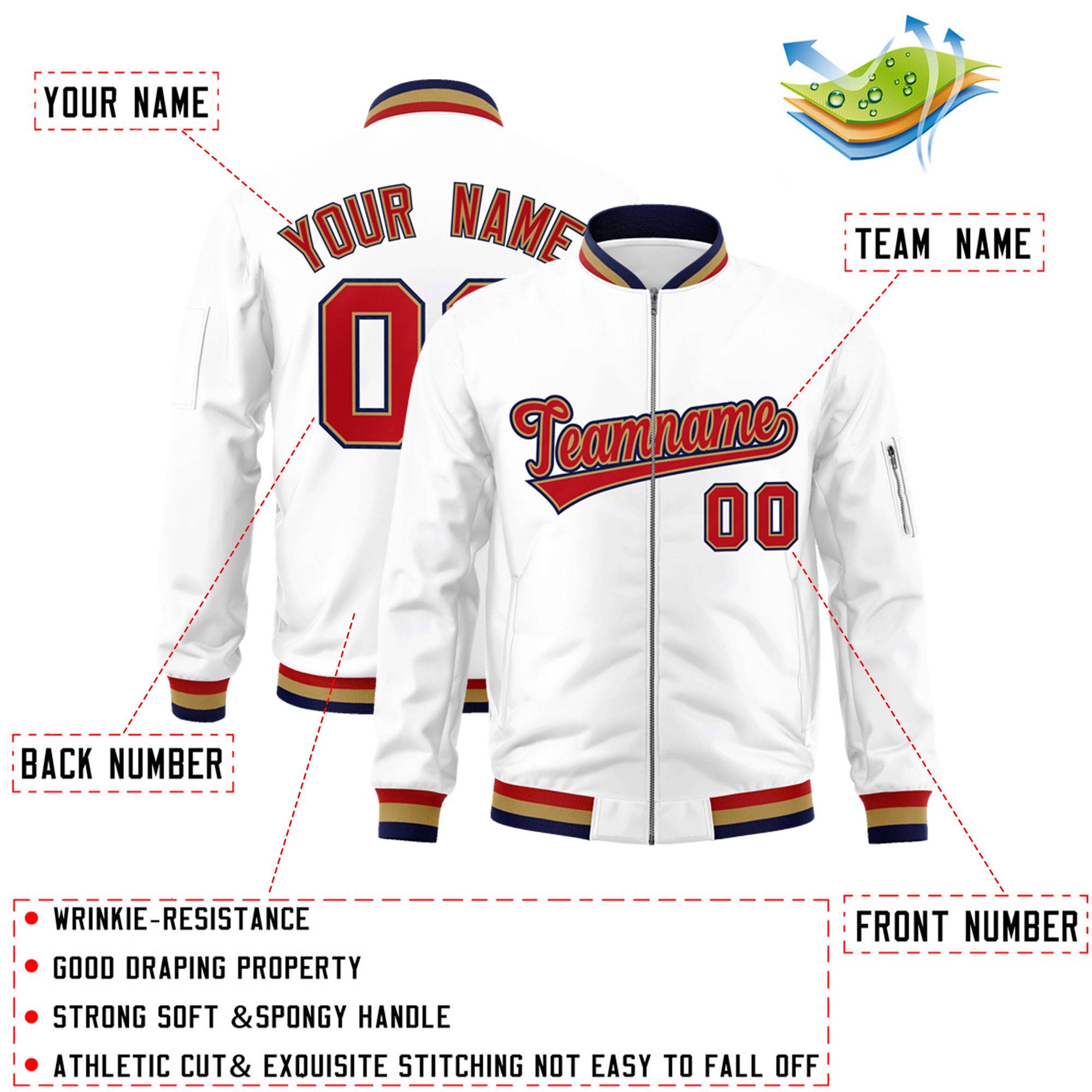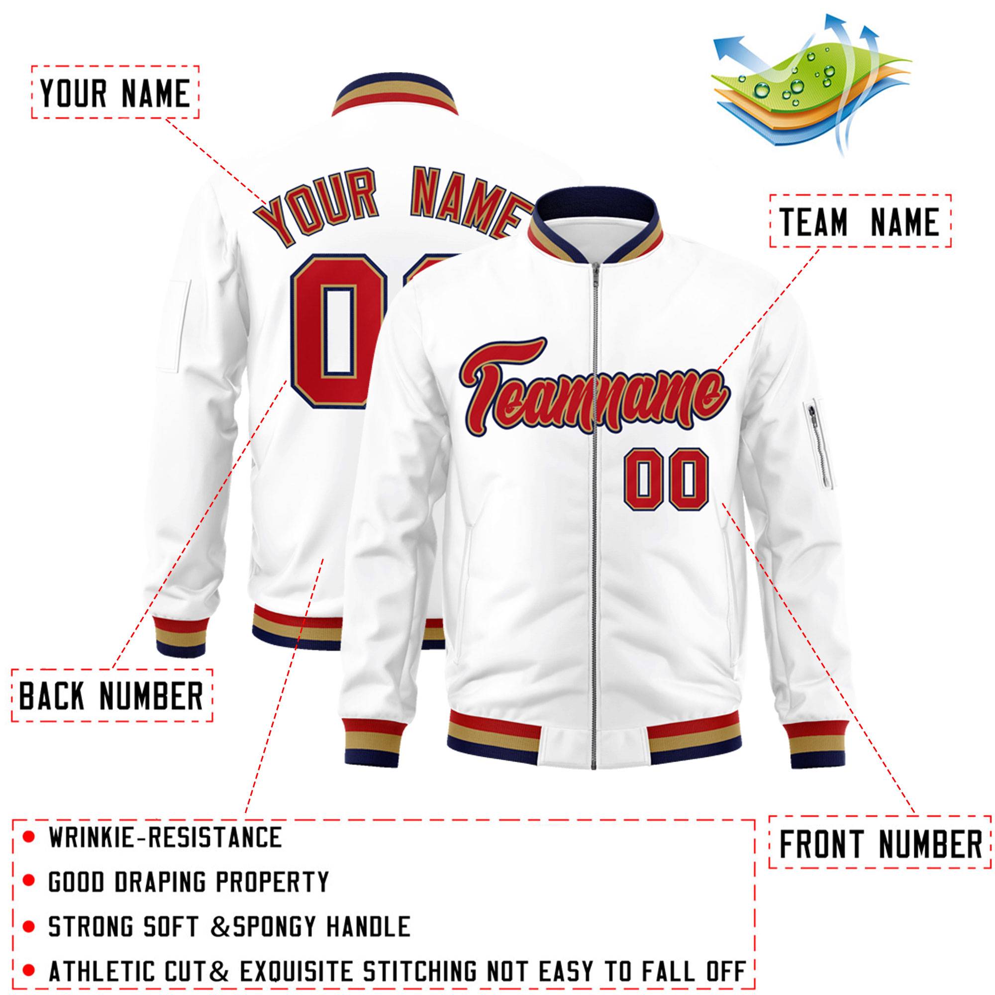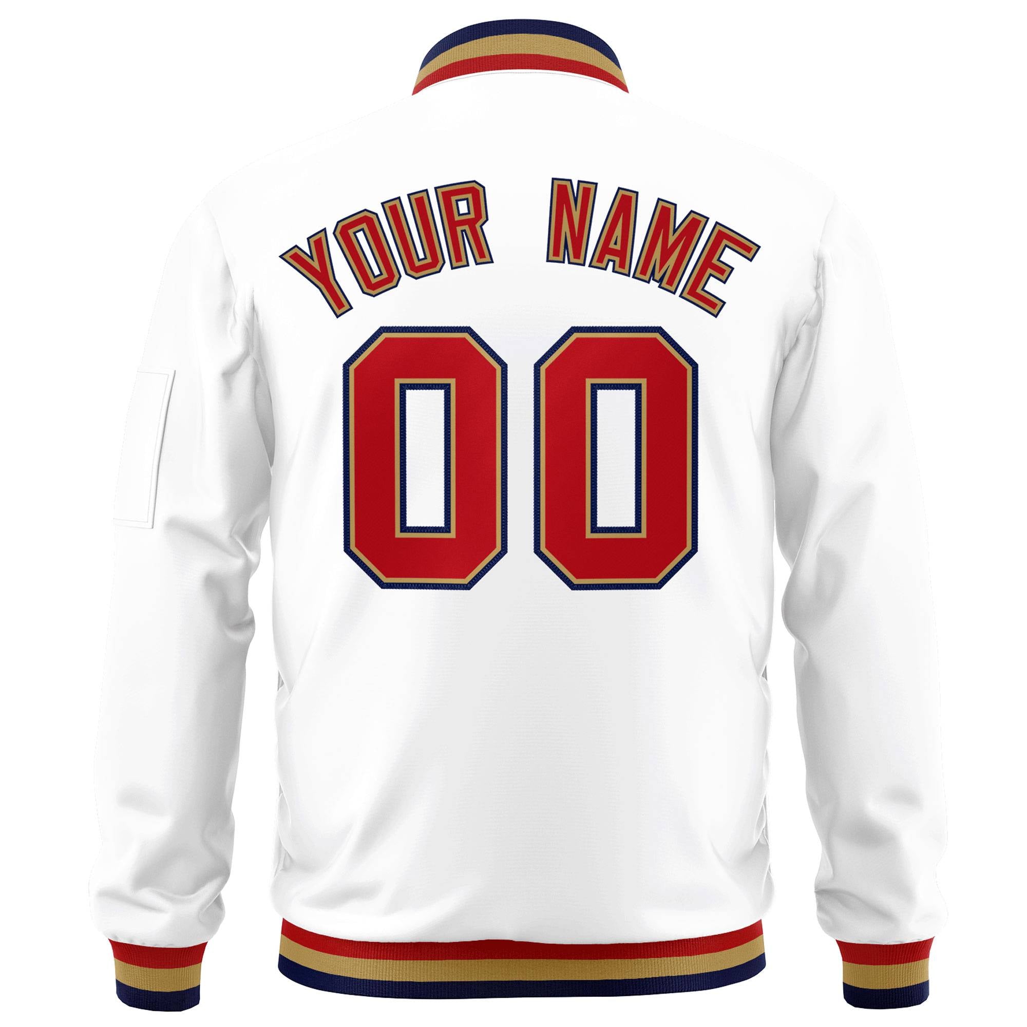 Custom White Red-Old Gold Varsity Full-Zip Letterman Bomber Jacket