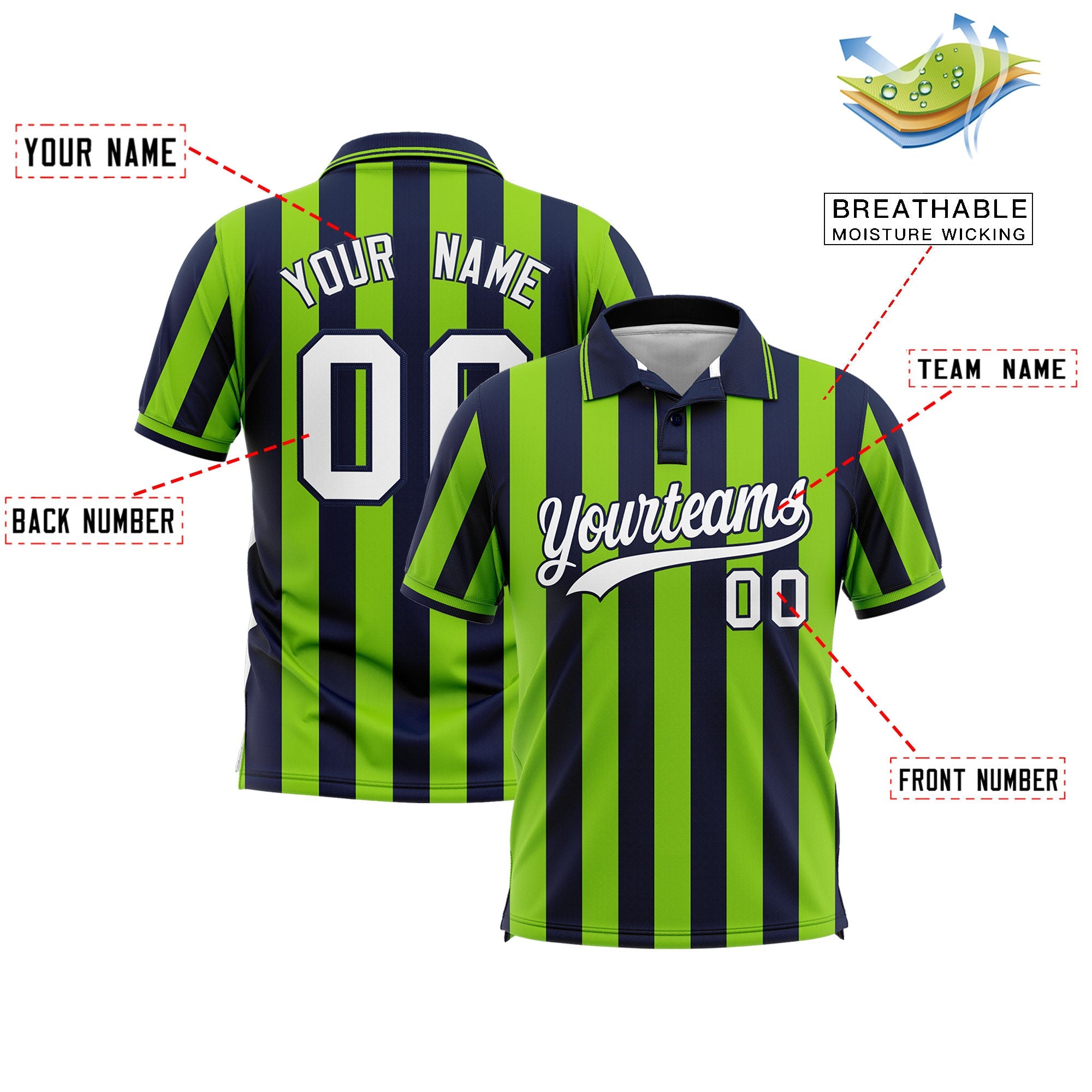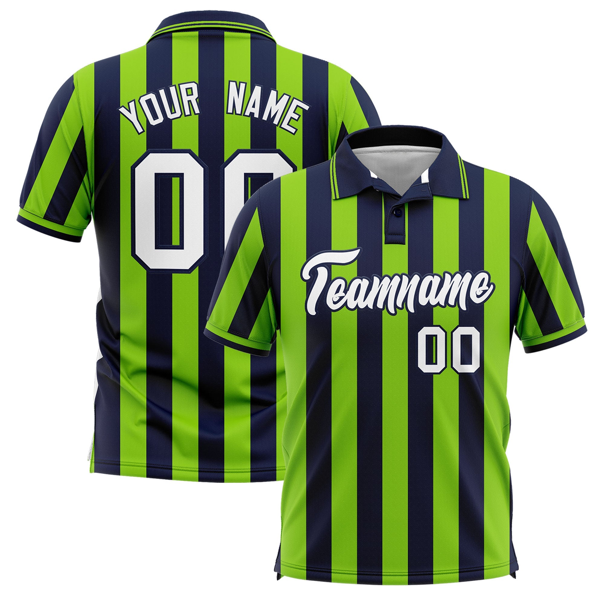 Custom Navy Neon Green Vertical Stripes Design Performance Polo Shirt