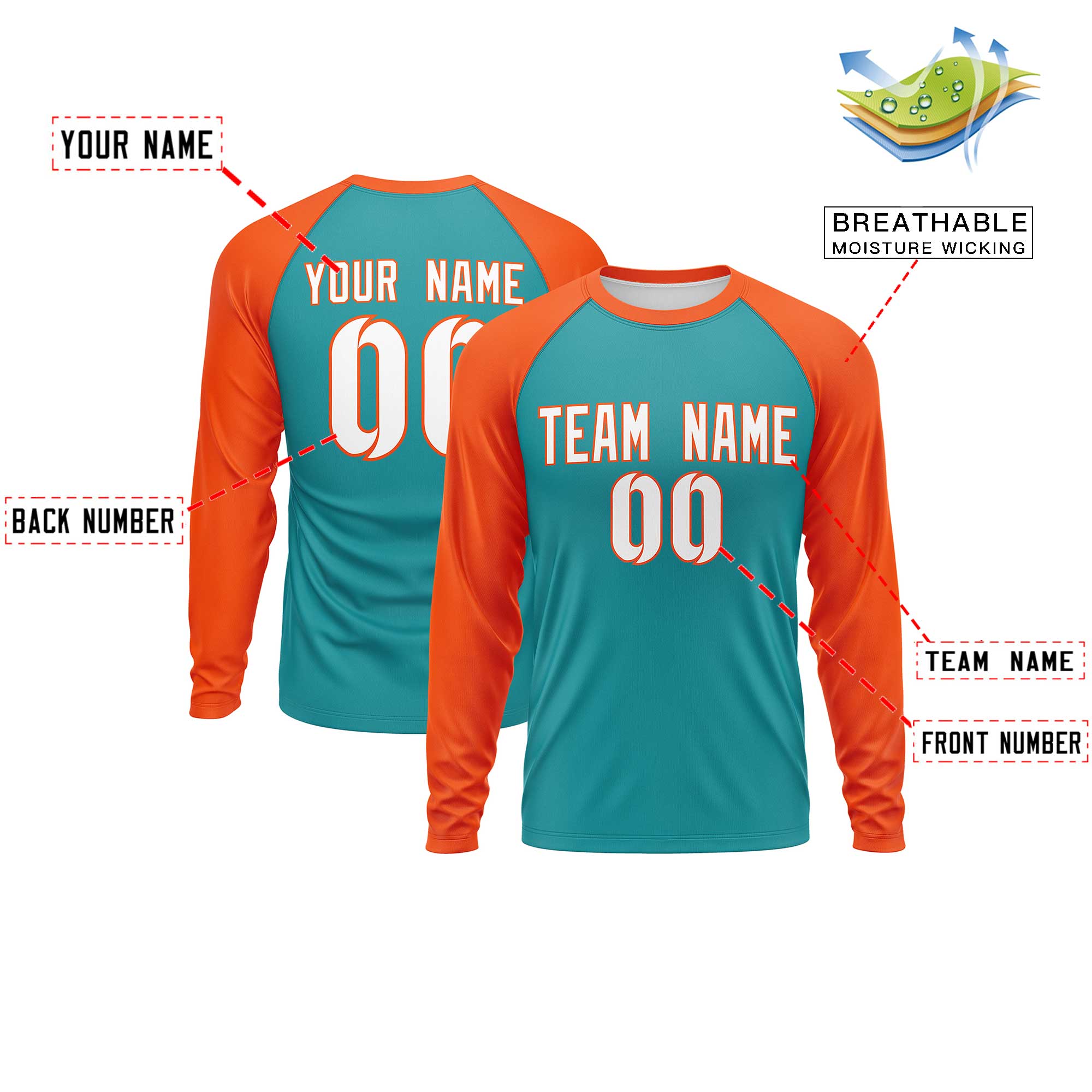 Custom Aqua Orange Crew Neck Raglan Long Sleeve Performance T-Shirt