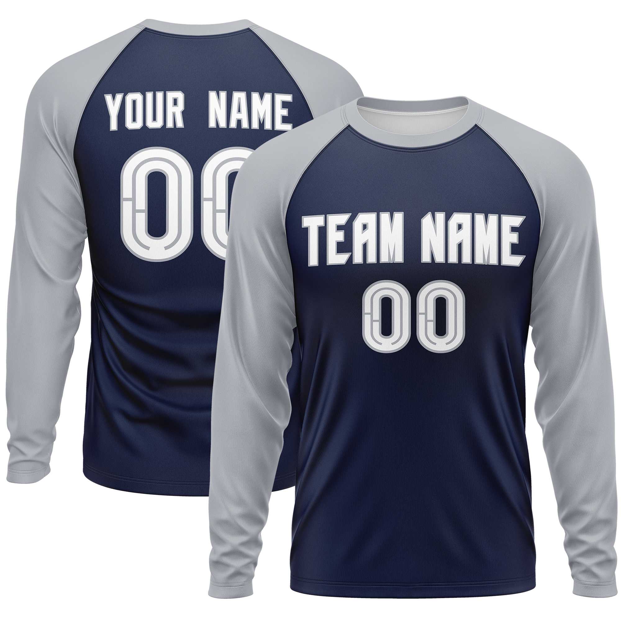 Custom Navy Gray Crew Neck Raglan Long Sleeve Performance T-Shirt