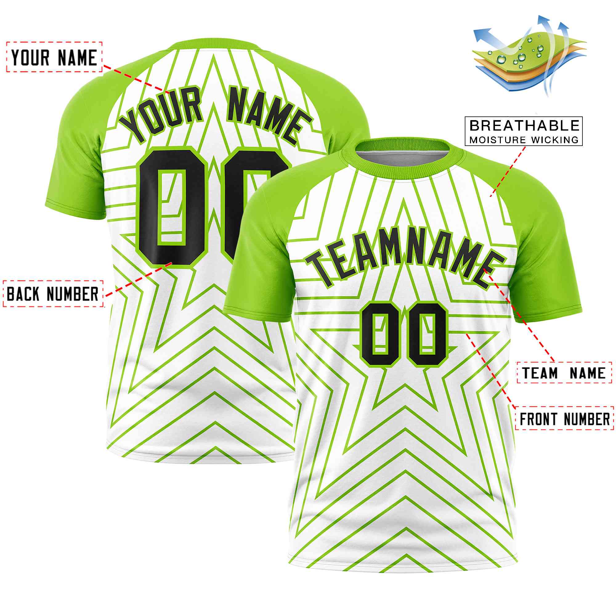 Custom White Neon Green Personalized Star Pattern Raglan Sleeves Performance T-Shirt