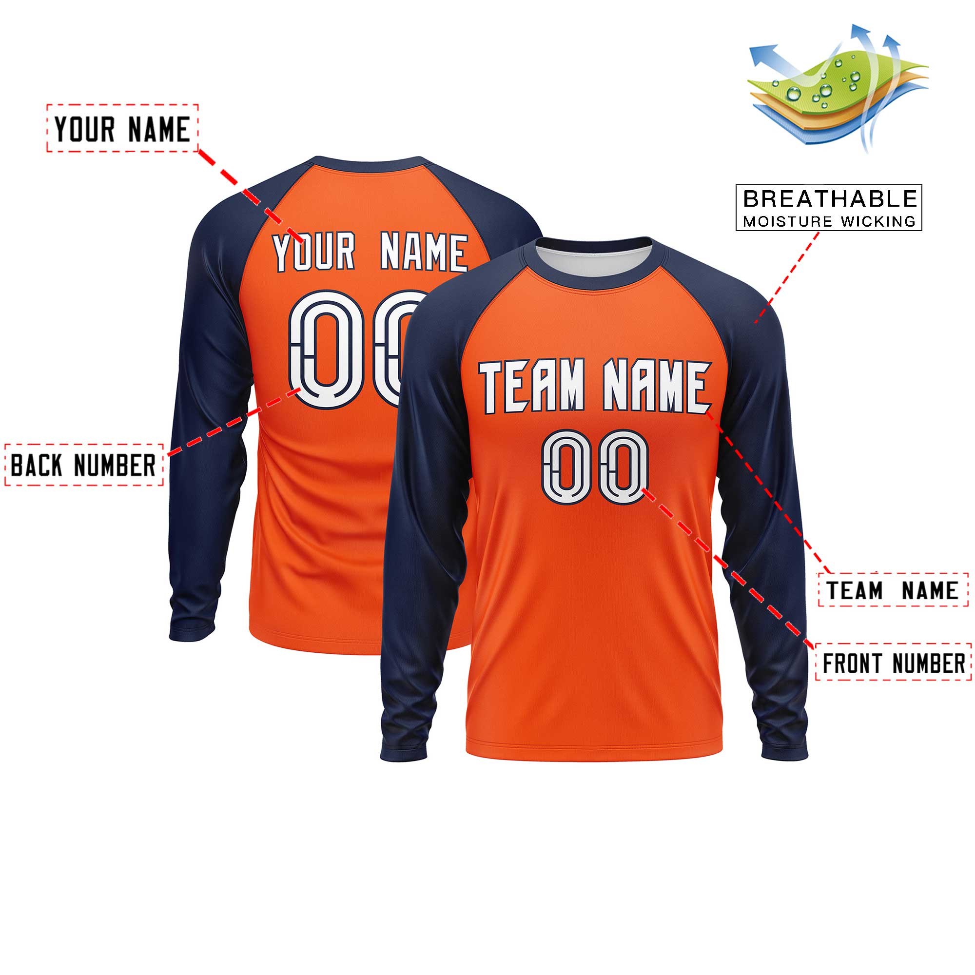 Custom Orange Navy Crew Neck Raglan Long Sleeve Performance T-Shirt