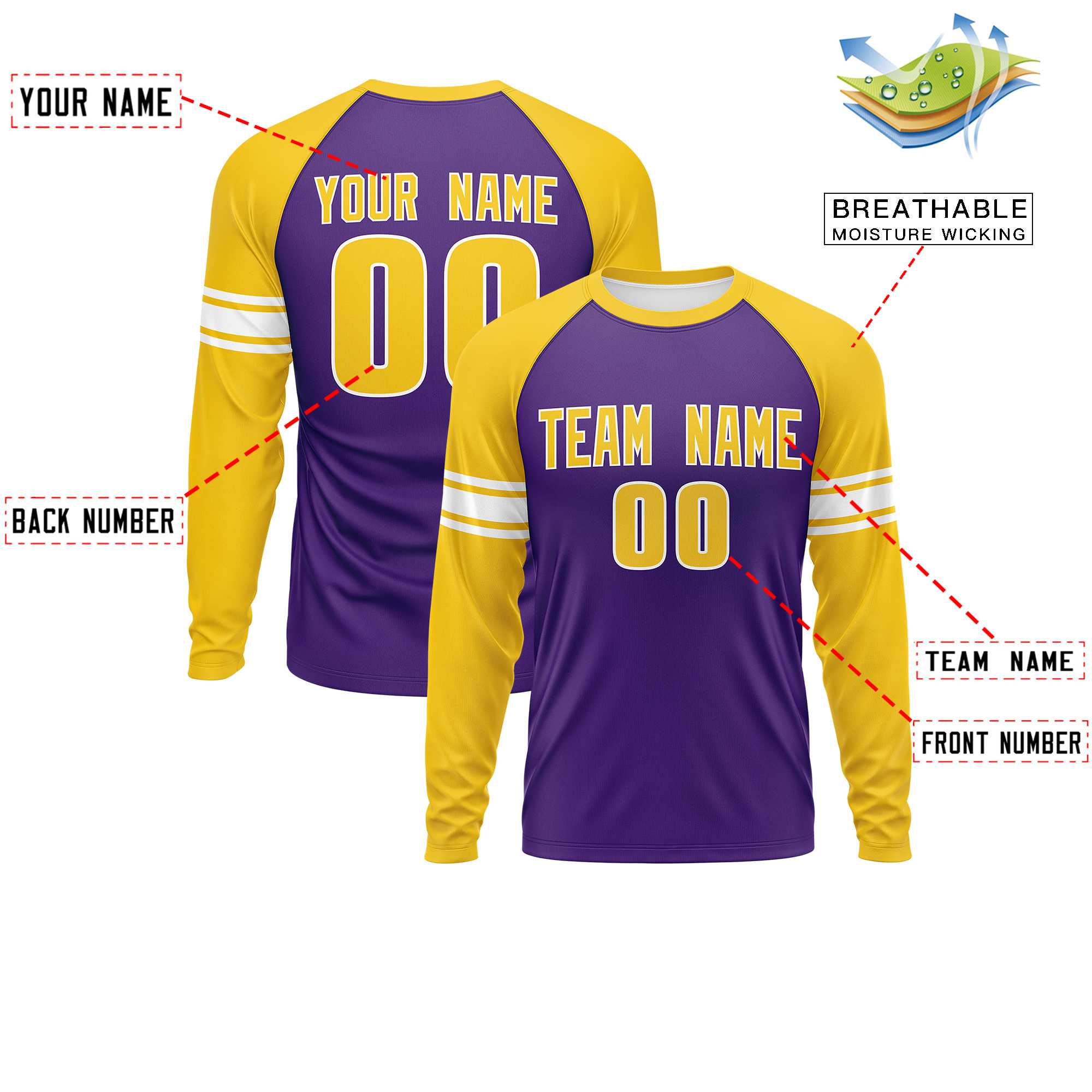 Custom Purple Gold White Crew Neck Personalized Raglan Long Sleeve Performance T-shirt