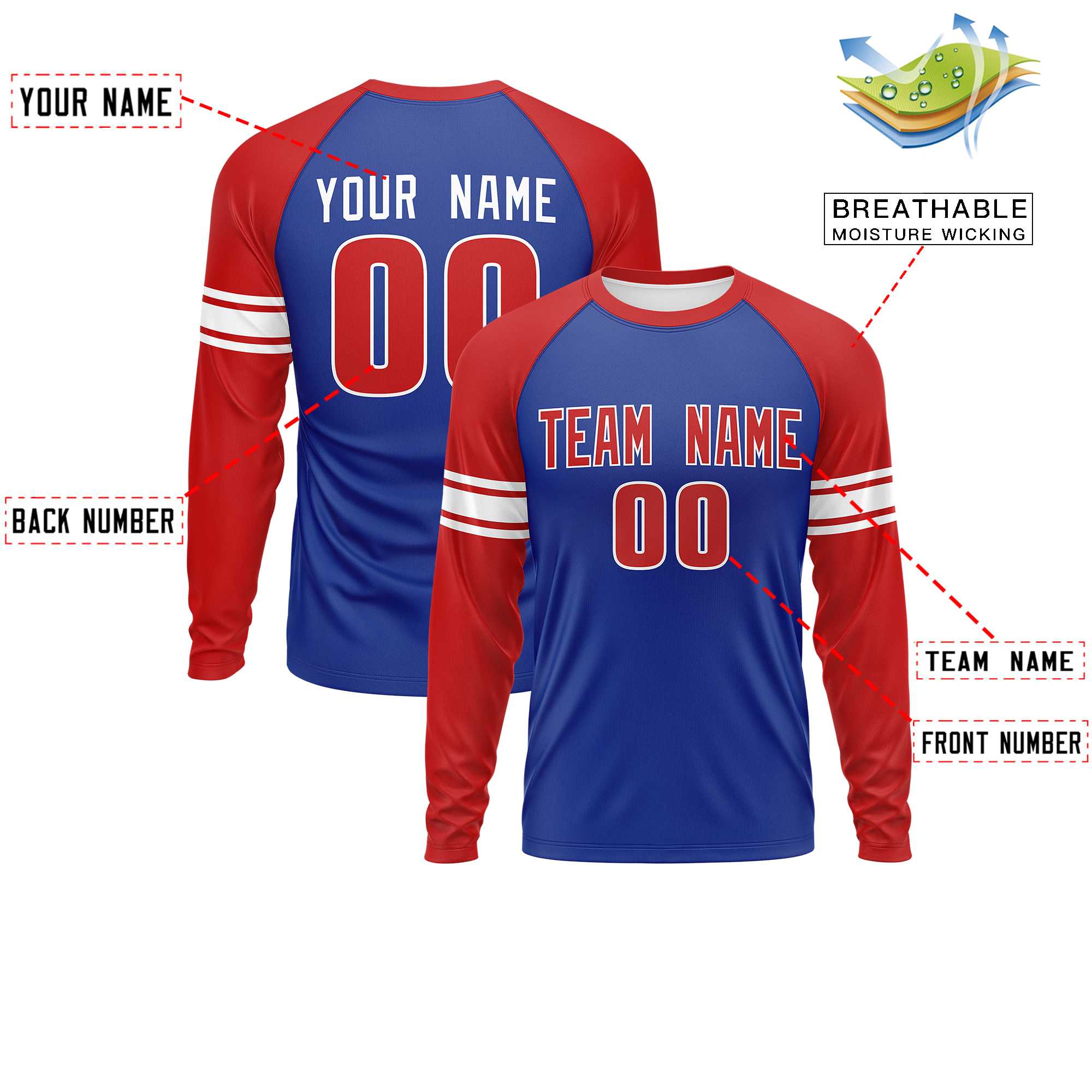 Custom Royal Red White Crew Neck Personalized Raglan Long Sleeve Performance T-shirt