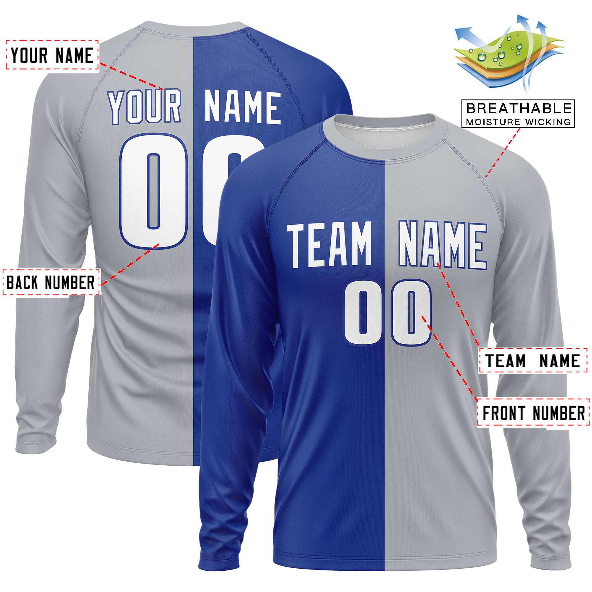 Custom Royal Gray Crew Neck Split Design Long Sleeve Performance T-Shirt