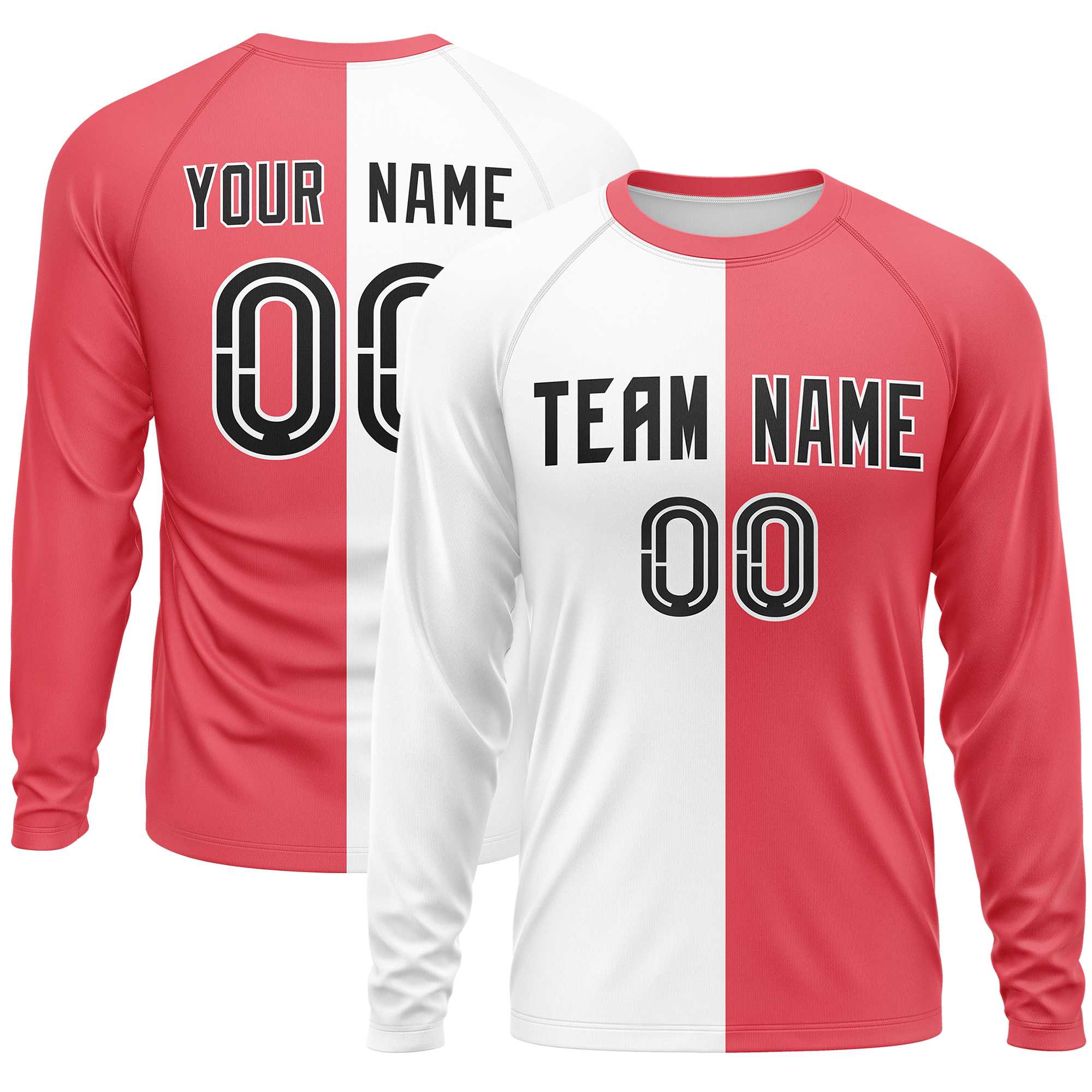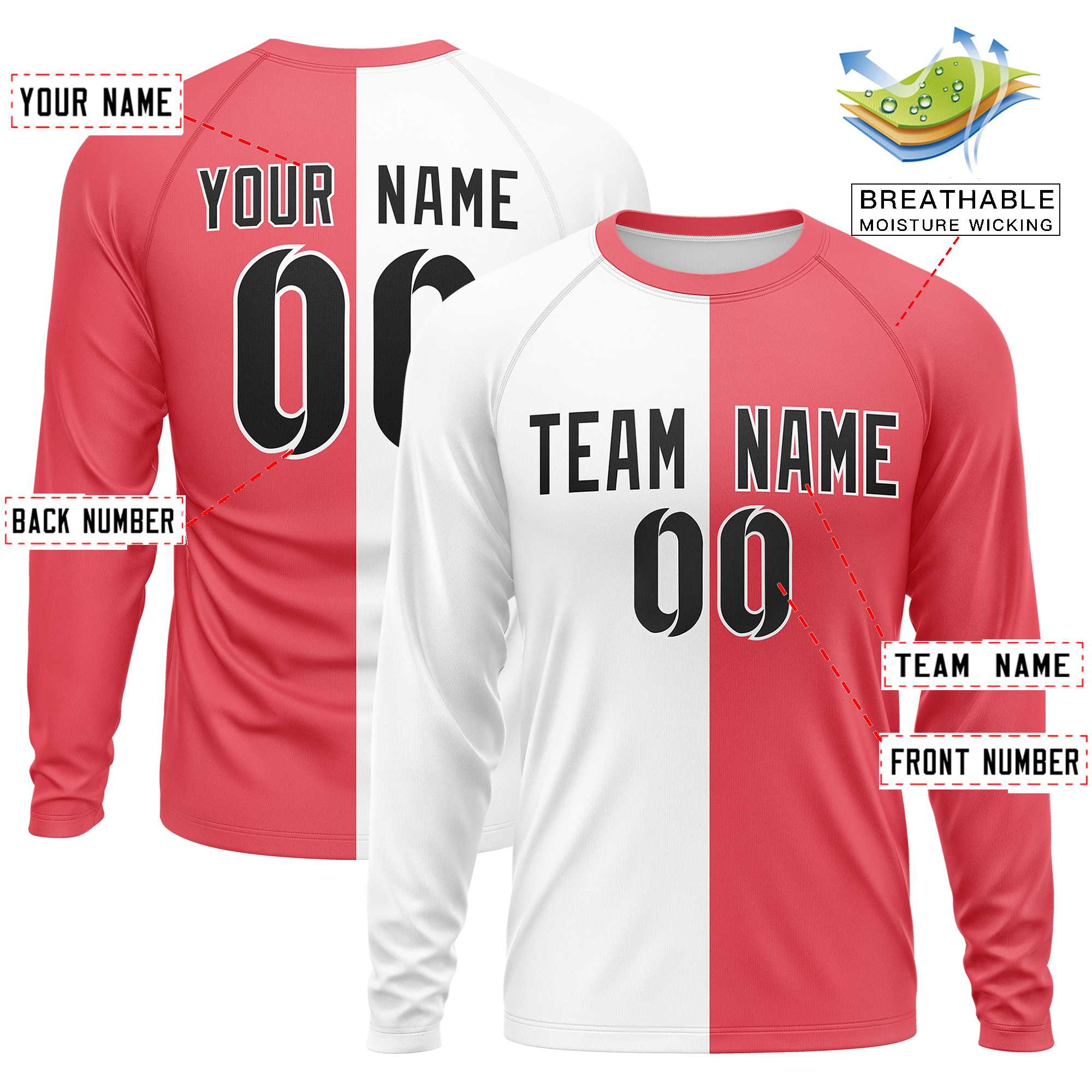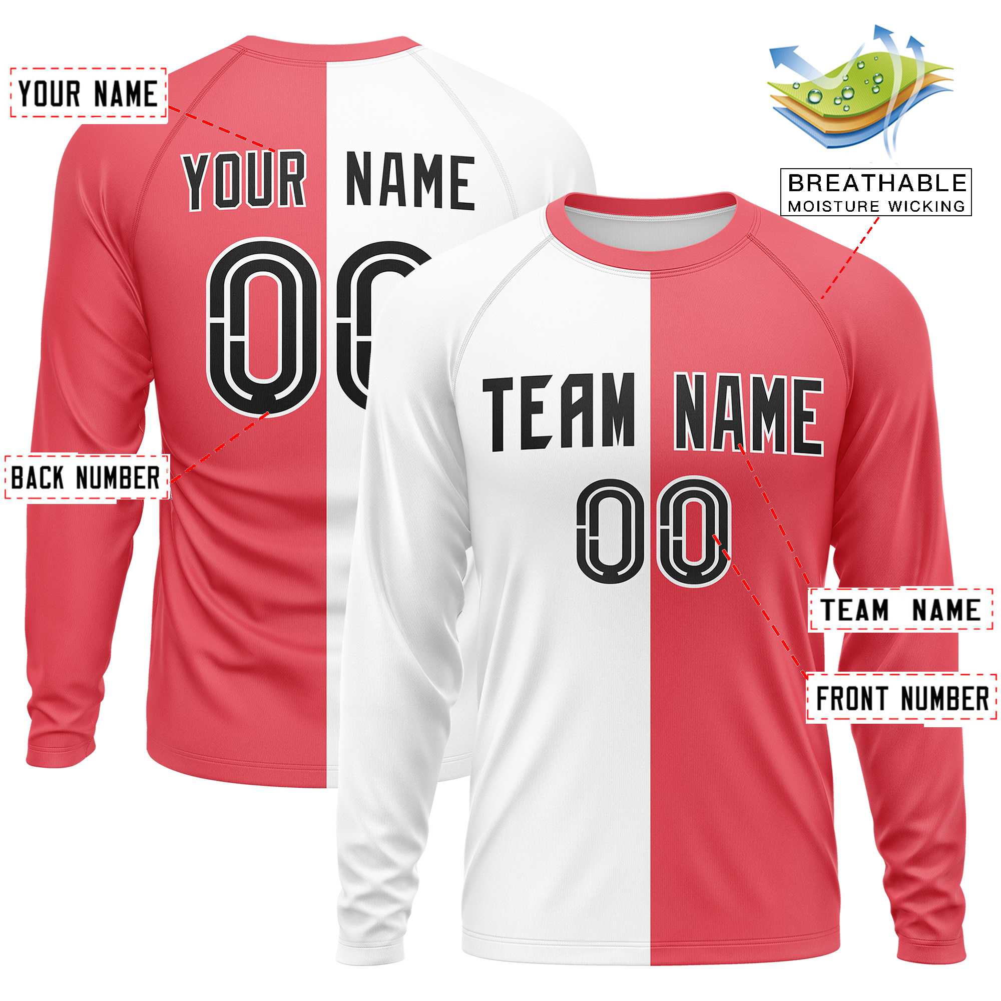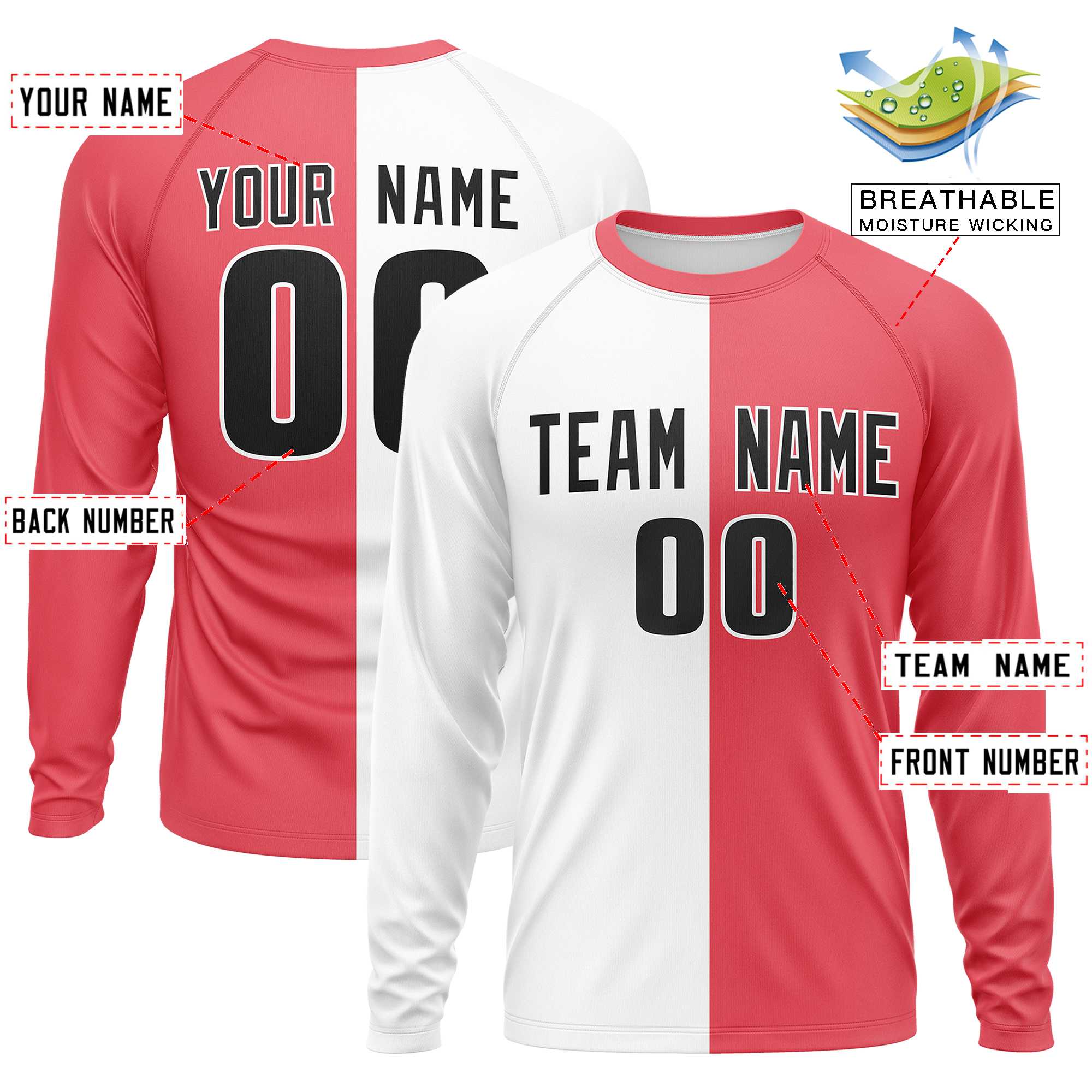 Custom White Light Red Crew Neck Split Design Long Sleeve Performance T-Shirt