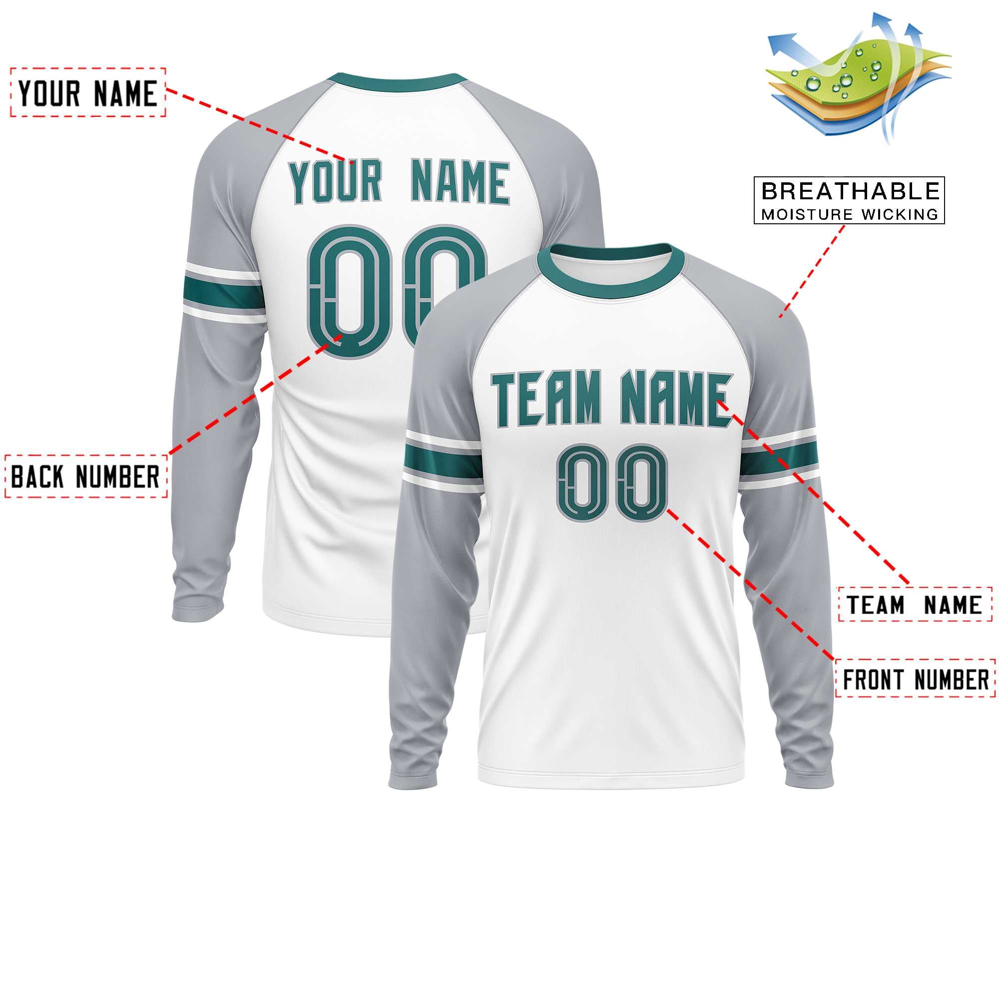 Custom White Gray Aqua Crew Neck Personalized Raglan Long Sleeve Performance T-shirt