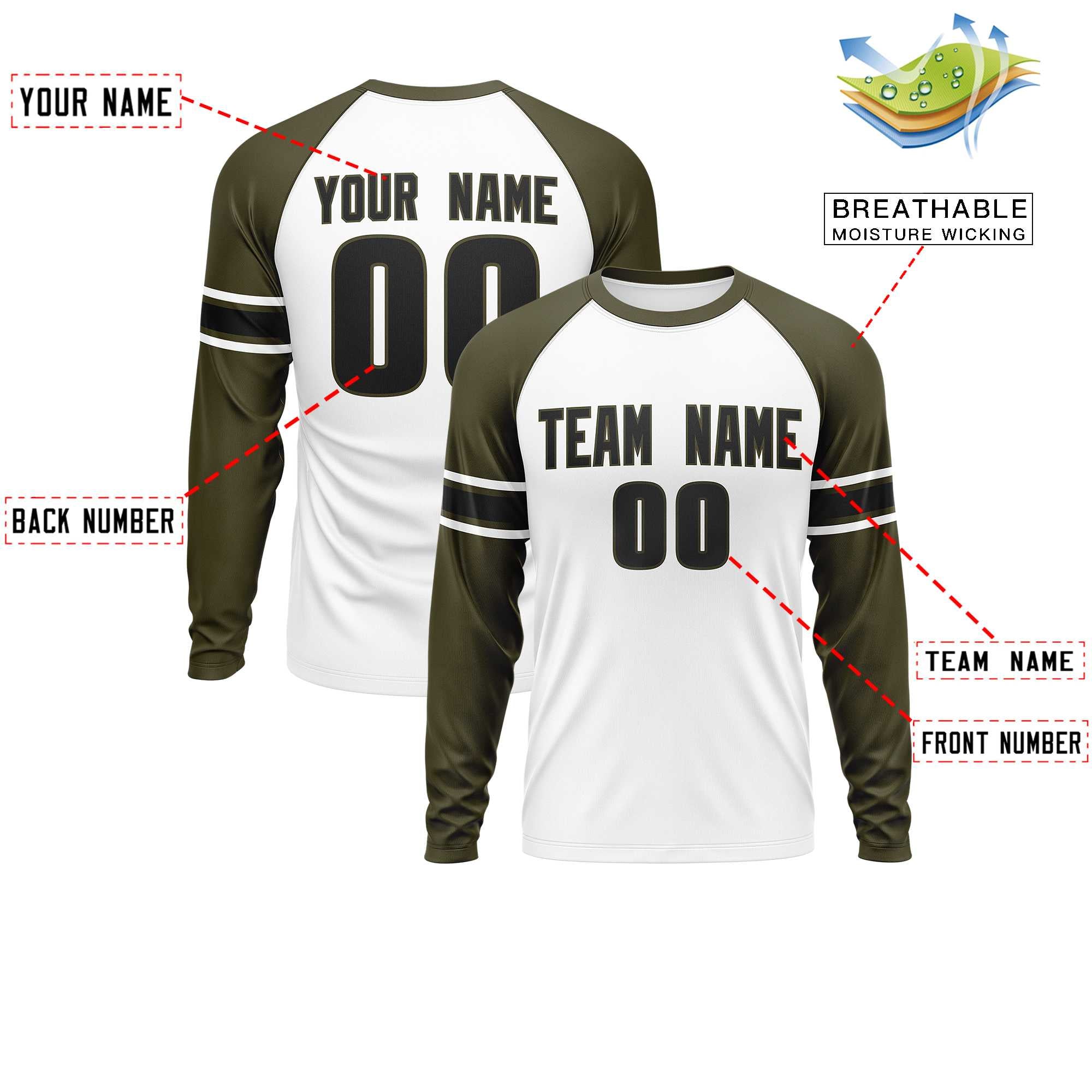 Custom White Olive Black Crew Neck Personalized Raglan Long Sleeve Performance T-shirt