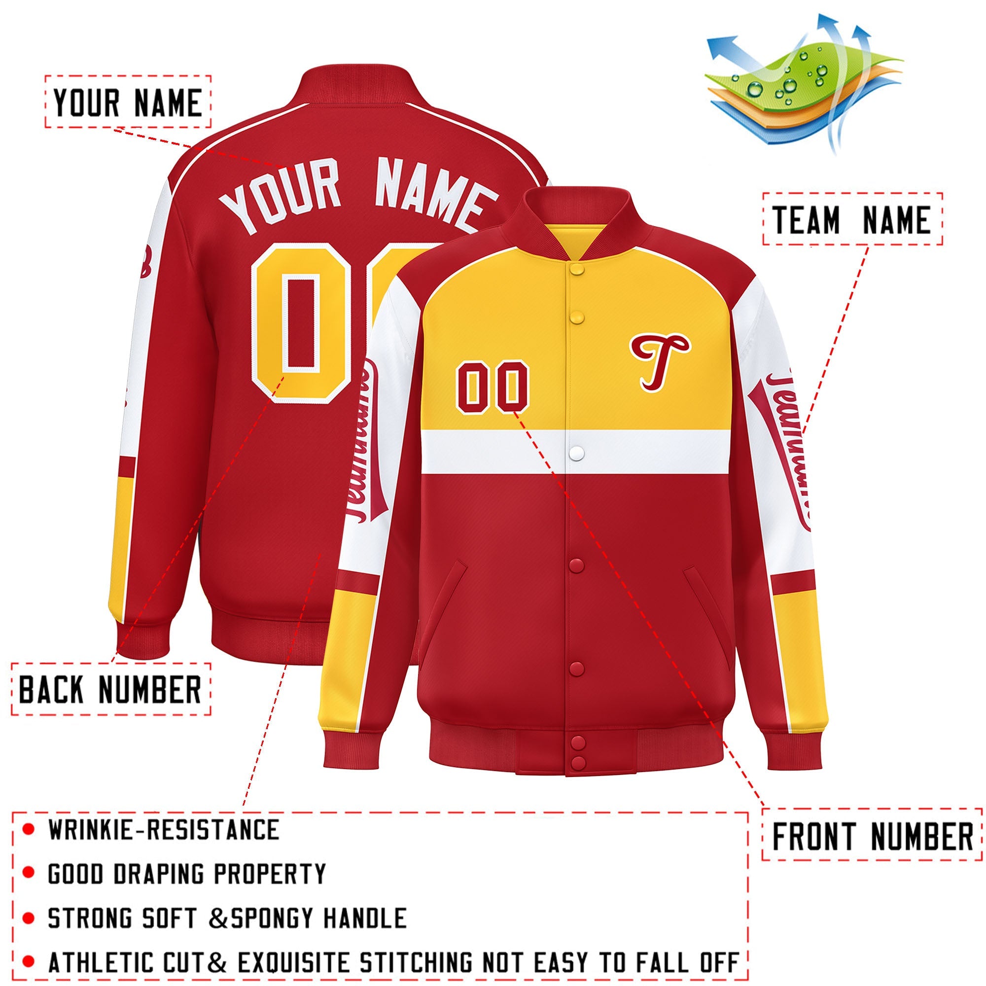 Custom Yellow Red Varsity Full-Snap Raglan Sleeves Letterman Jacket