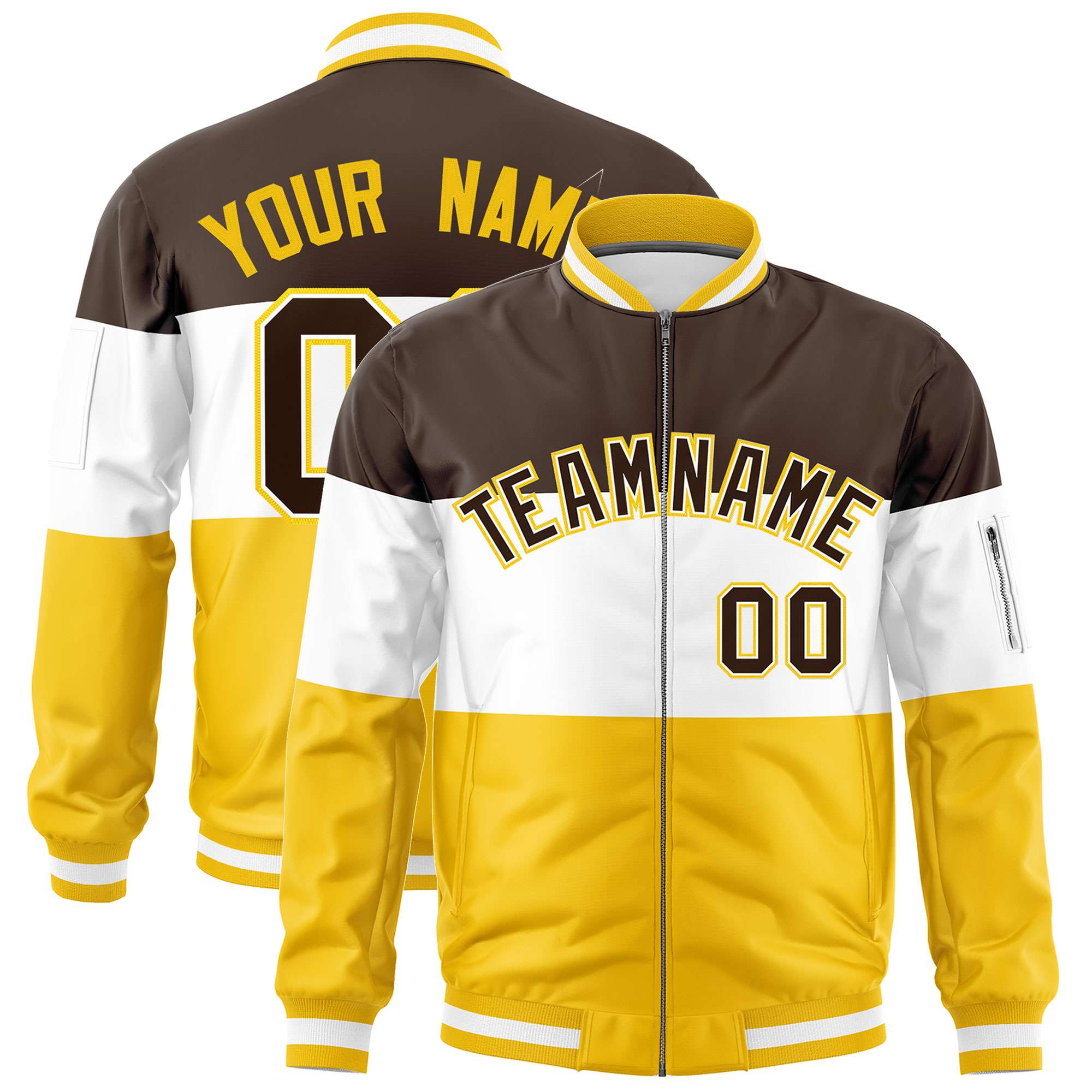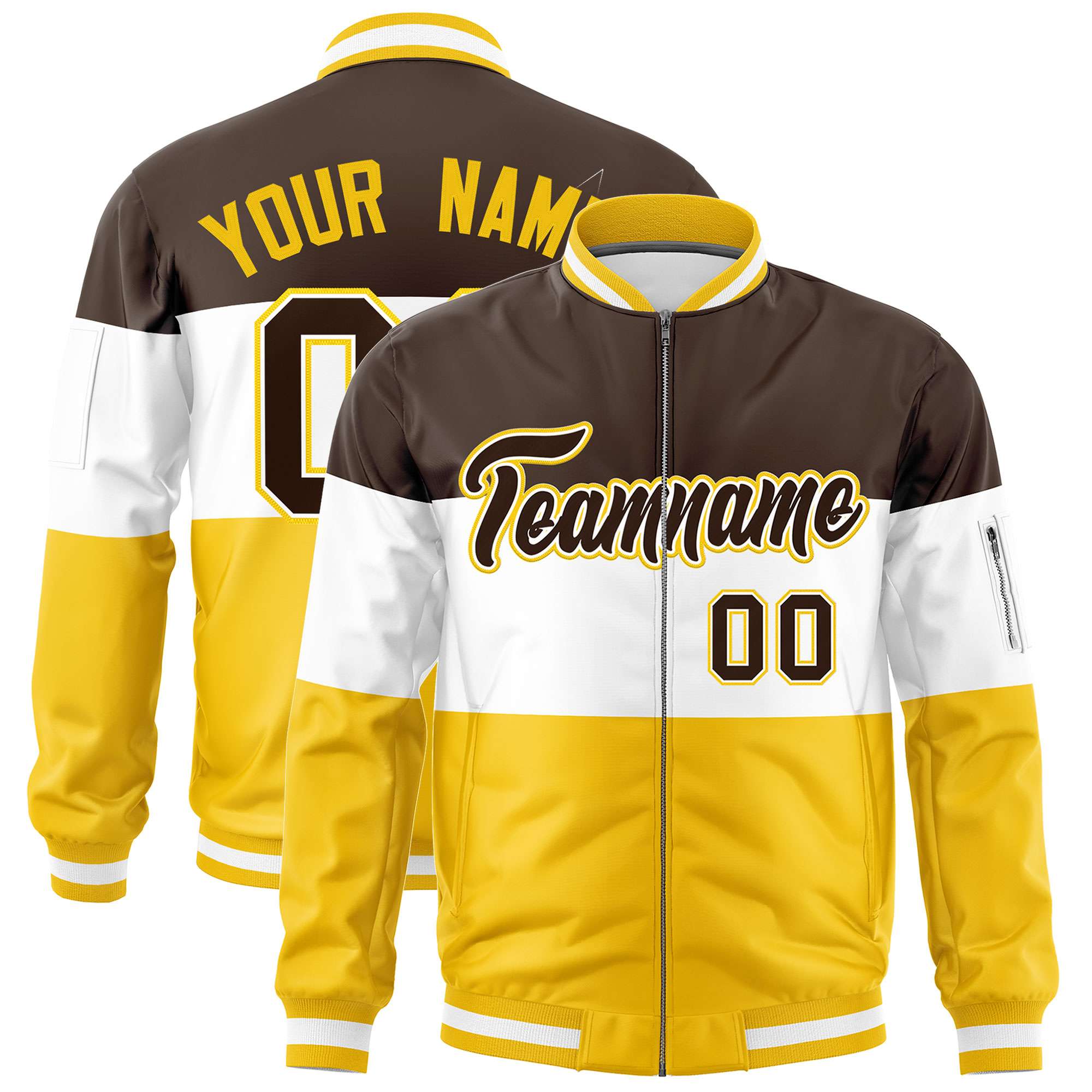 Custom Brown White-Gold Varsity Full-Zip Color Block Letterman Bomber Jacket